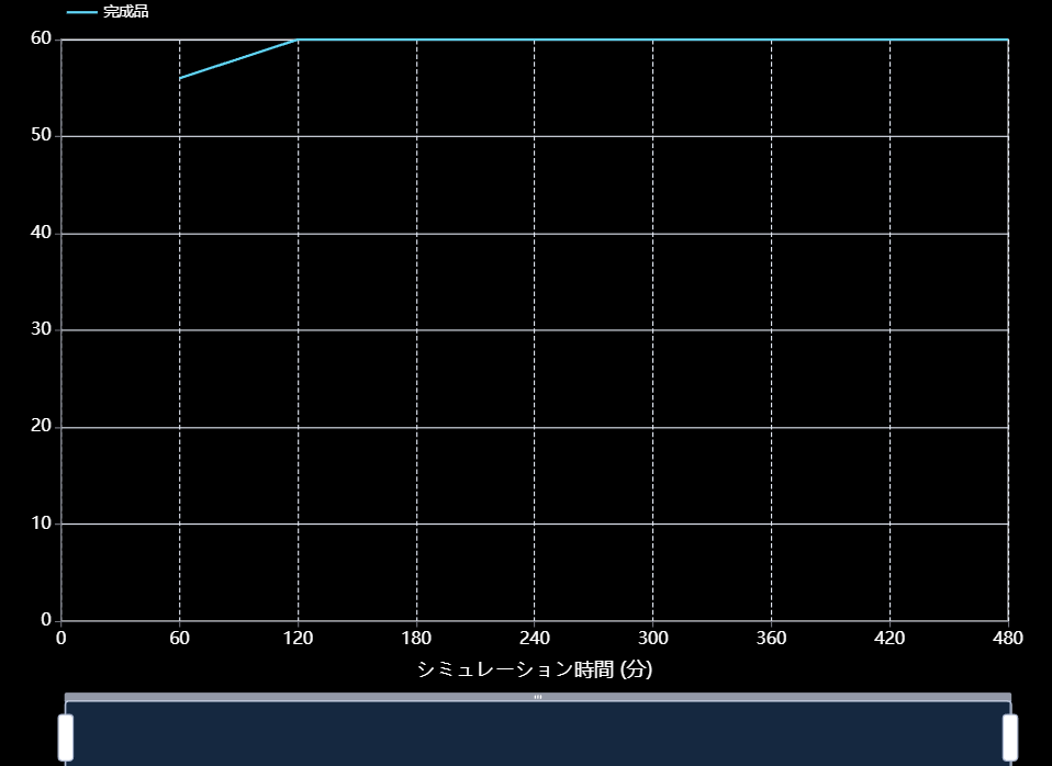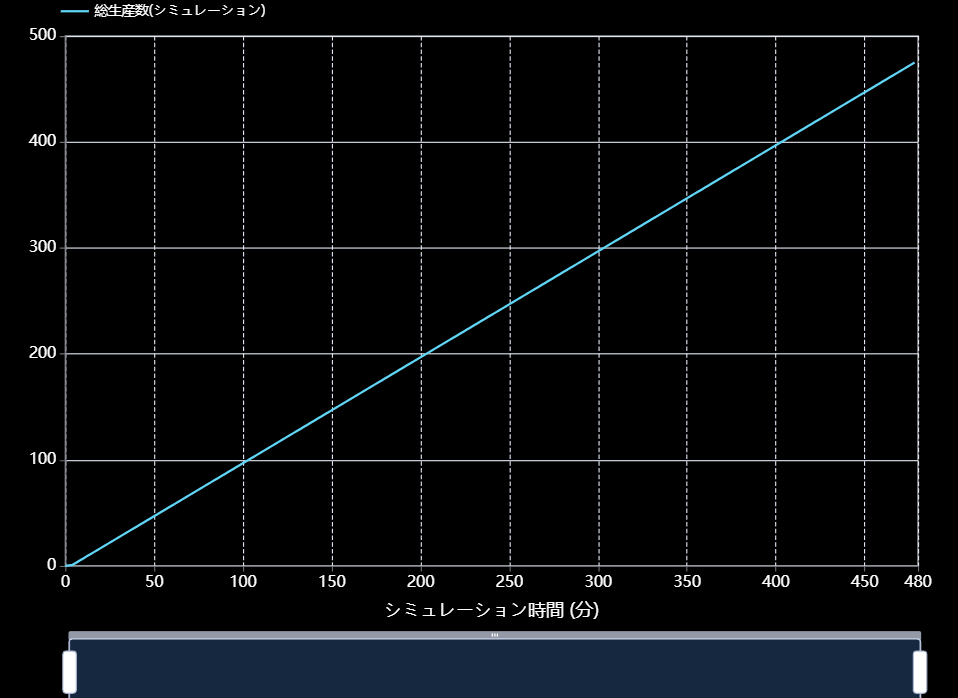 パラメーターの設定が終わったら、シミュレーションの時間の設定画面が立ち上がるので、8時間=480分と設定してシミュレーションを実行します。シミュレーションが終了したら表示するグラフを選びます。下図のようにグラフ(「累積生産数」、「生産推移」、「生産数」)が表示されれば、問題なく動作しているといえます。