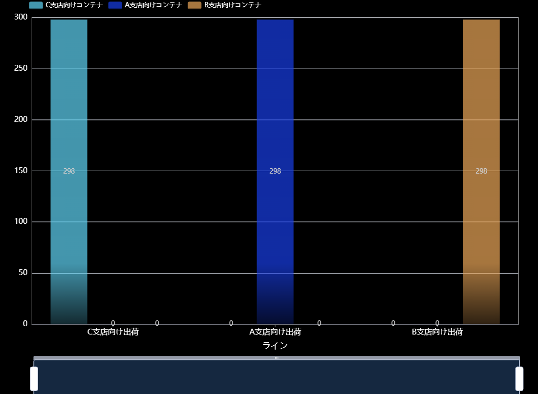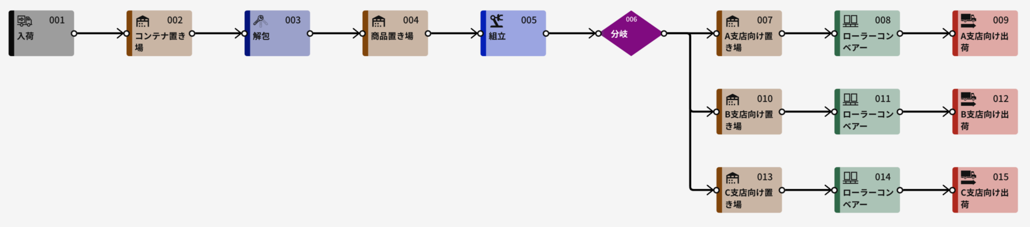 このような流れをassimeeで再現することで、通過型センターの動きを視覚的に把握でき、ボトルネックの探索や、生産計画や物流設計の参考にすることができます。