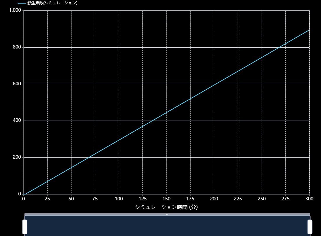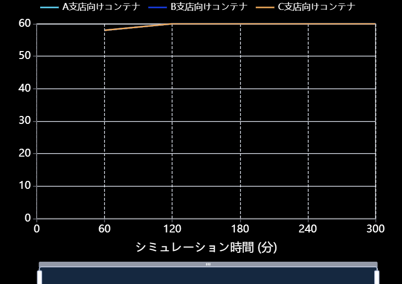 モデルの作成が終わったらシミュレーションを実行します。今回は、シミュレーション時間を「300分」にシミュレーションを行いました。シミュレーションが設定どおりに動いていれば、グラフから以下のような結果が確認できます。