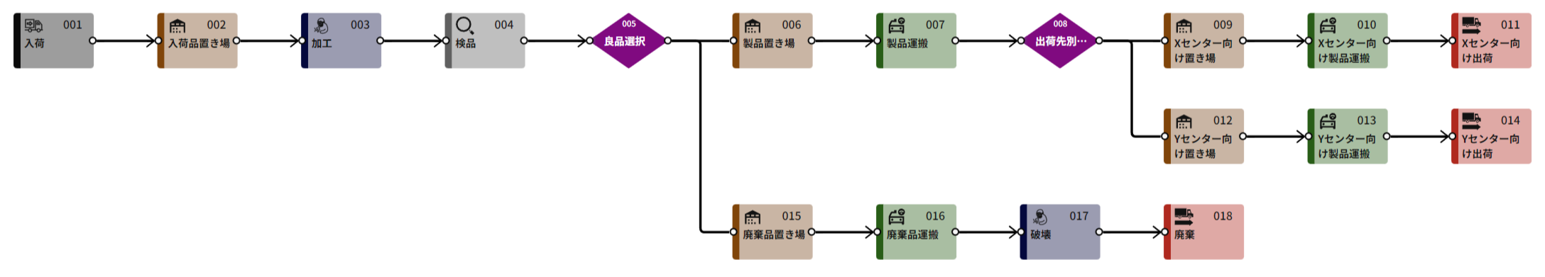 まず、モデルを作成します。下図が今回使用するモデルとなります。小規模な工場を想定して、検品と廃棄、配送先仕分けのための分岐プロセスを2か所含んでいます。プロセスは入荷→置き場→加工→検品→分岐(廃棄ルート:置き場→運搬(AGV)→加工→出荷)→置き場→運搬(AGV)→分岐→置き場→運搬(AGV)→出荷の各プロセスからなります。