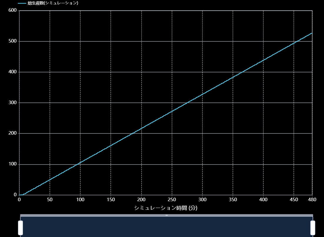 パラメーター設定が終了したらシミュレーションを行います。今回はシミュレーション時間を「480分」に設定します。シミュレーションが終わったら結果を確認します。以下のように累積生産推移、生産推移、ライン別生産数、生産割合を選択します。