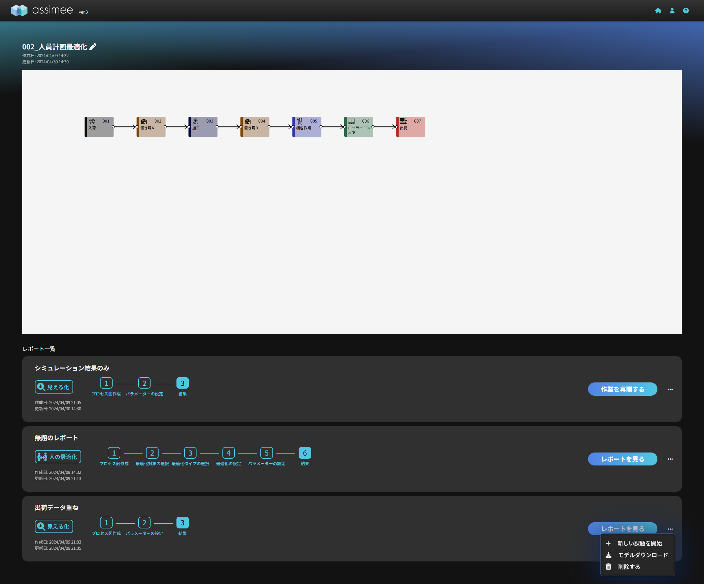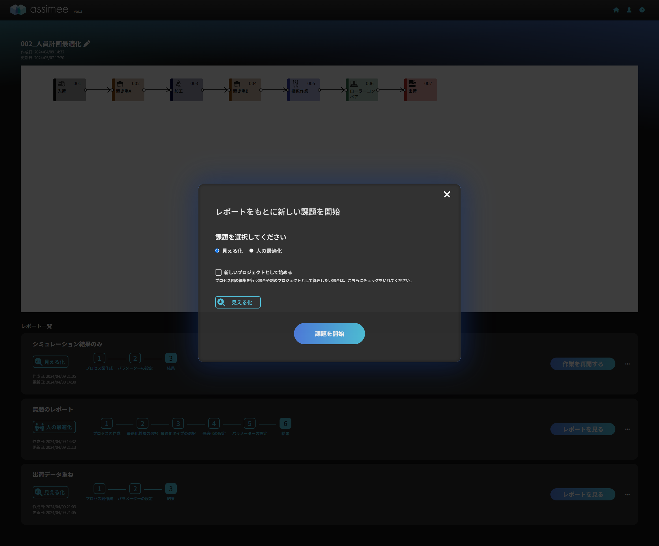 次に最適化を行ってみましょう。上で作ったモデル(レポート)をレポート一覧で確認し、「新しい課題を開始」を押すことで、既存のモデルを活用ししつつ、新しい課題を開始することが出来ます。