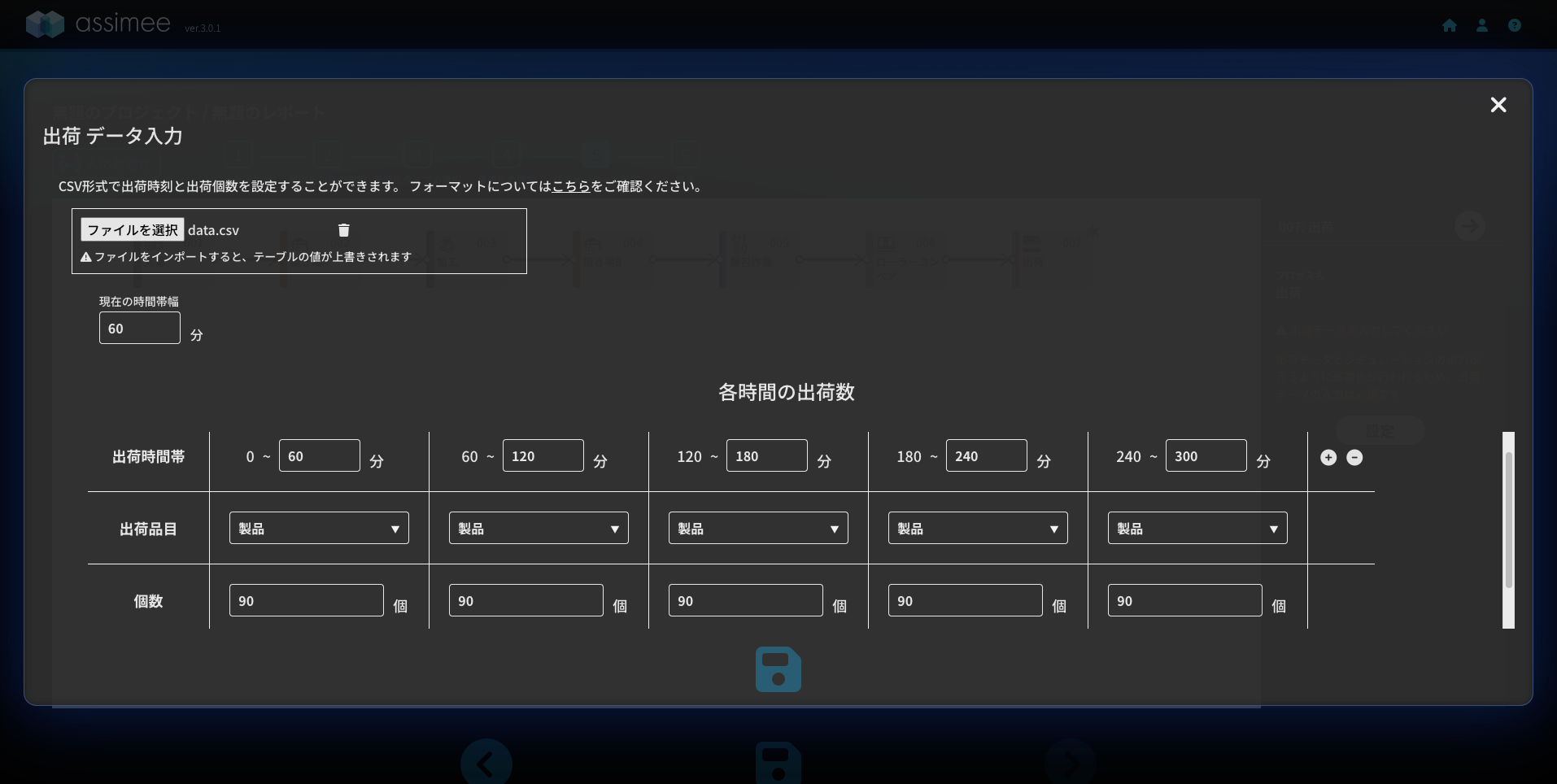 300,製品,90作成したファイルは編集画面より読み込ませます。パラメーター設定画面で出荷カードを選択すると、以下の画面が表示されます。ファイルを選択を選び、上記のCSVファイルを読み込ませます。今回の出荷目標は工程の生産能力を下回っているので、担当のあなたは、加工や梱包作業の人員を減少させることで調整(最適化)が行う必要があります。この作業をassimeeに行わせてみましょう。