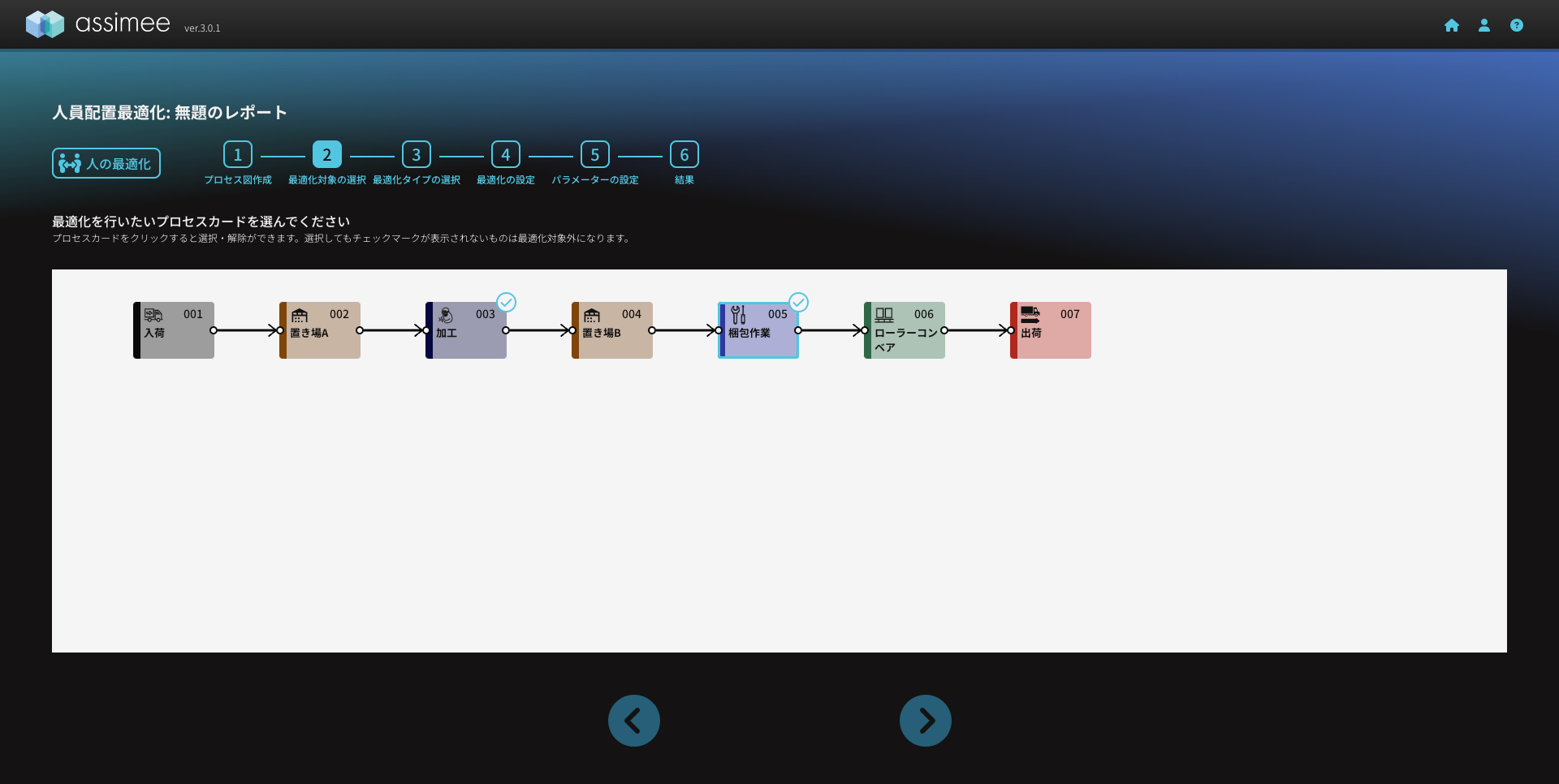 すると下図のように最適化対象のプロセスカードの選択画面が表示されます。今回は「003加工」の作業人員と、「005梱包作業」の作業人員をパラメーターとして最適化を行うので、「003加工」と「005梱包作業」を選択してください。