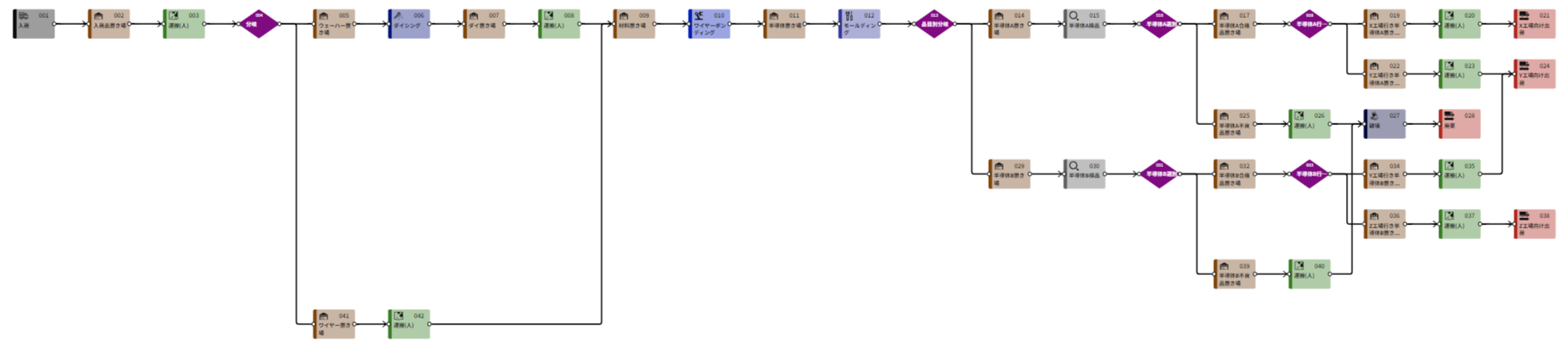 今回はウェーハーからのダイの切り出しや複数製品の製造、不良品の検査と良品の選別、出荷先の仕分けなどを盛り込んだ構成となります。