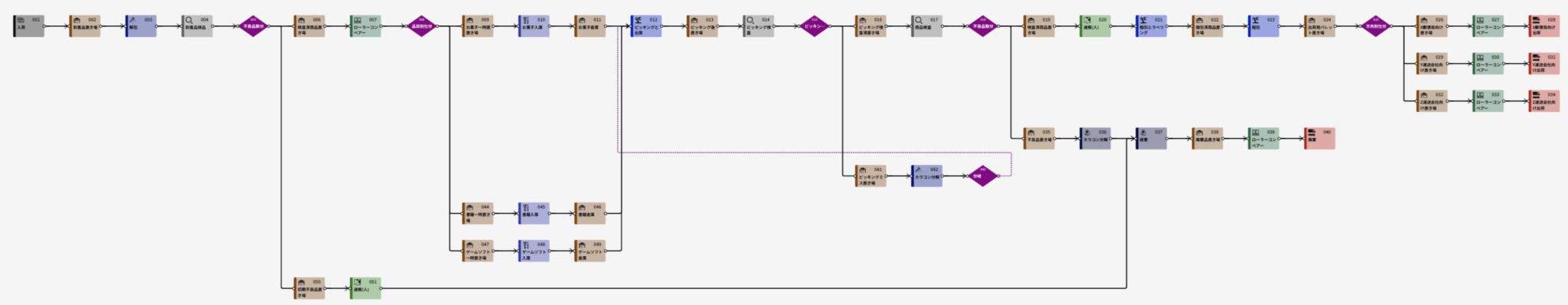 検品後工程として、分岐 → 置き場 → 運搬 → 分岐 の順にプロセスを配置し、検査に合格した商品は、次の入庫工程へ送るための流れを構成します。初期検品で不合格となった商品は、別ルートで廃棄処理へ送ります。