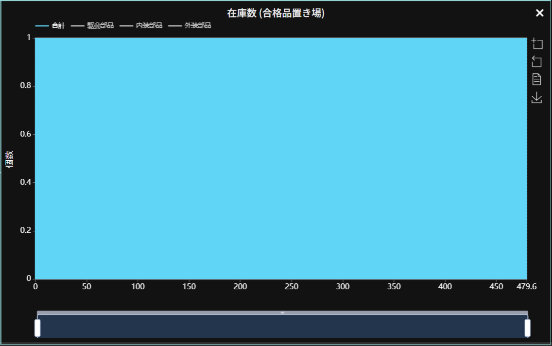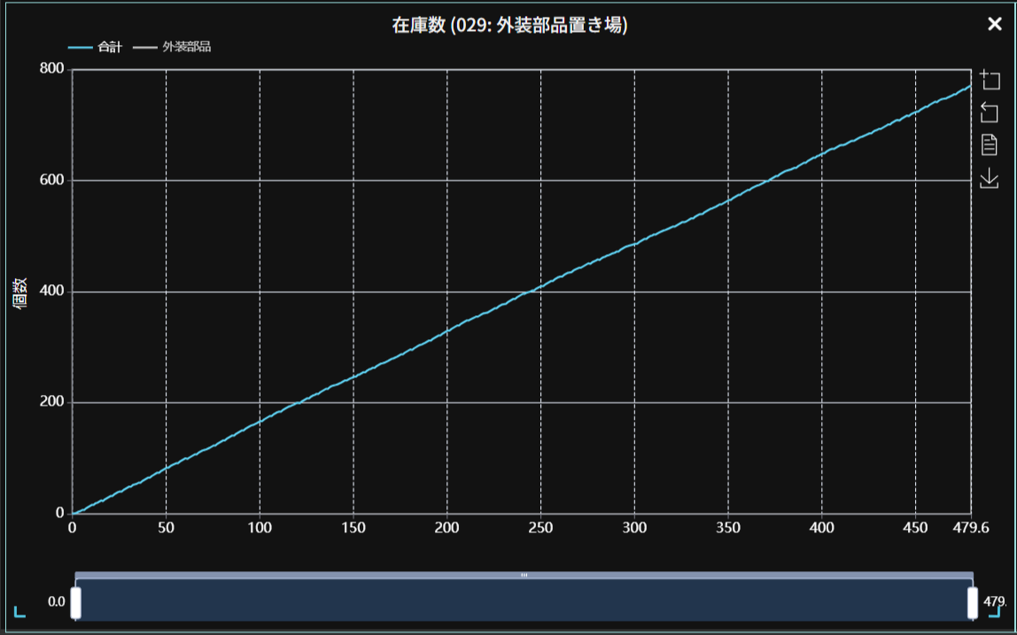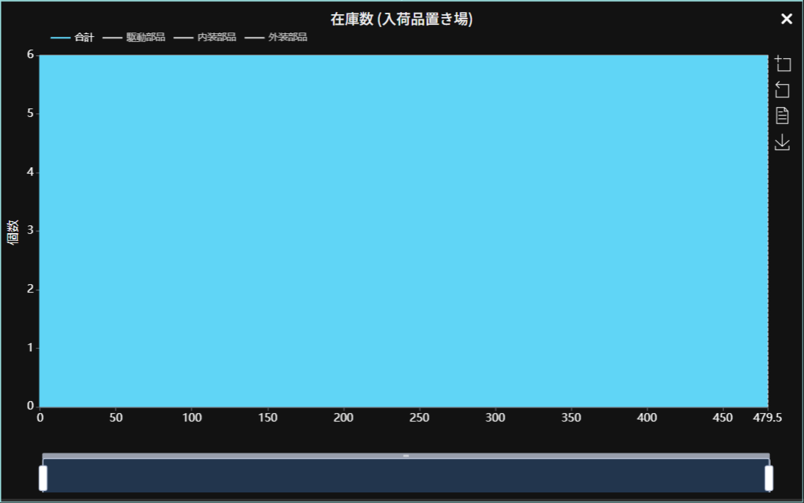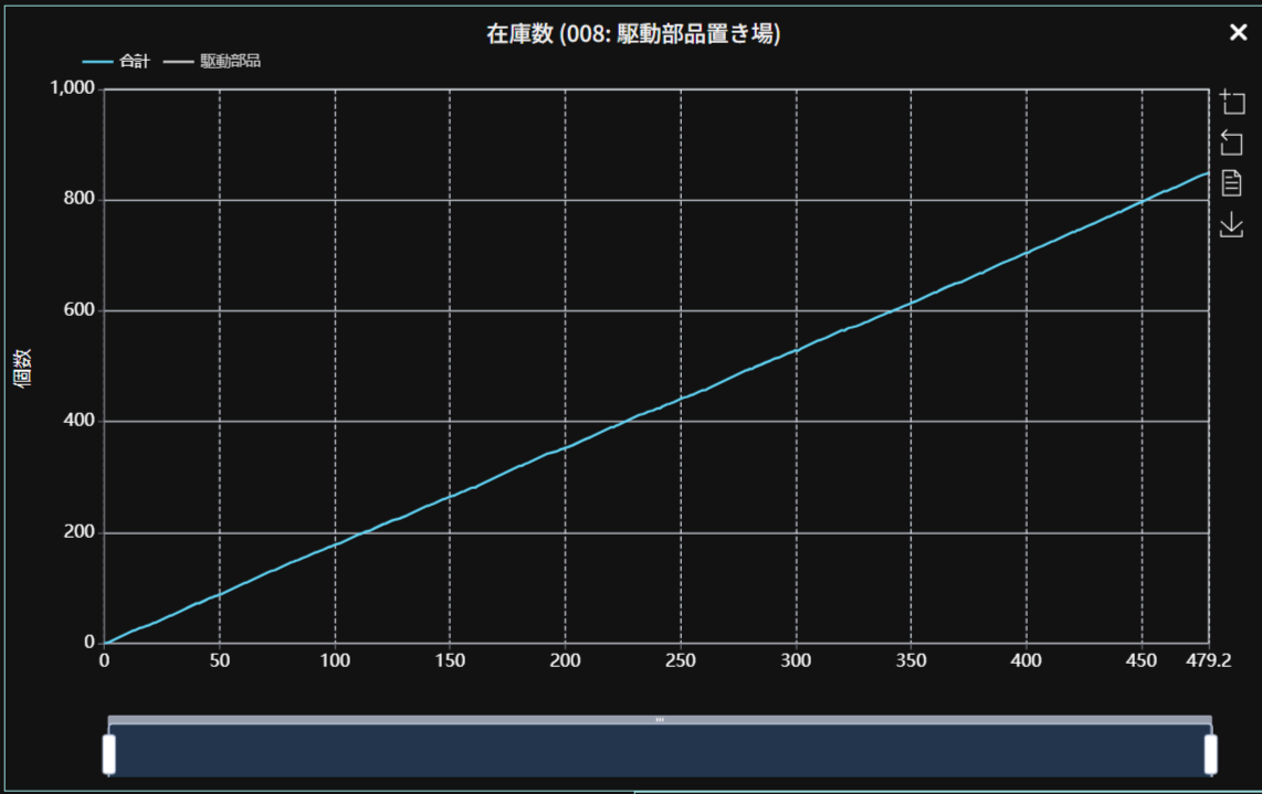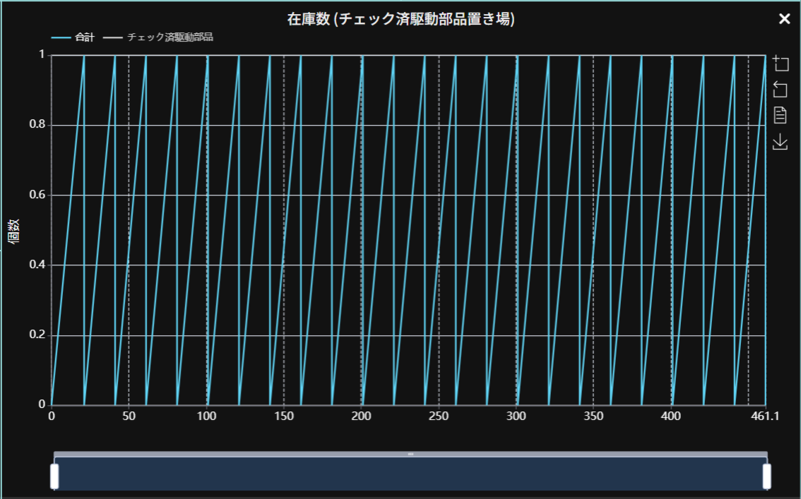 3つのプロセス共に稼働率が100%に達しており、加工能力が不足していることが分かります。最後に念のため上流側の2つの置き場「002入荷品置き場」と「005合格品置き場」も確認します。この2つの置き場共に在庫が少なく、これらの下流側にボトルネックはないことが分かります。