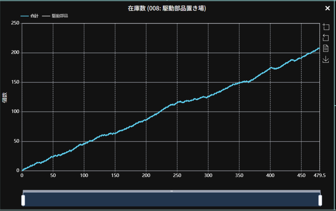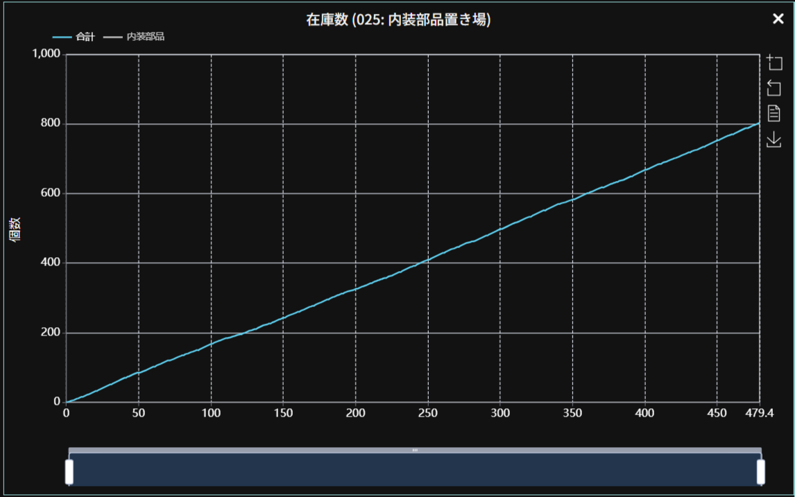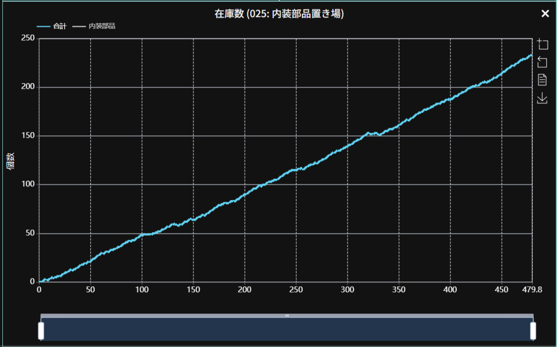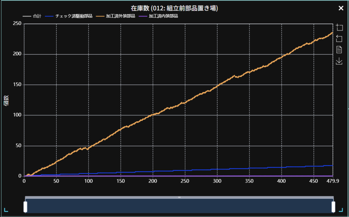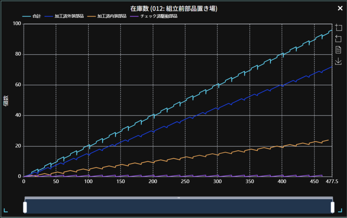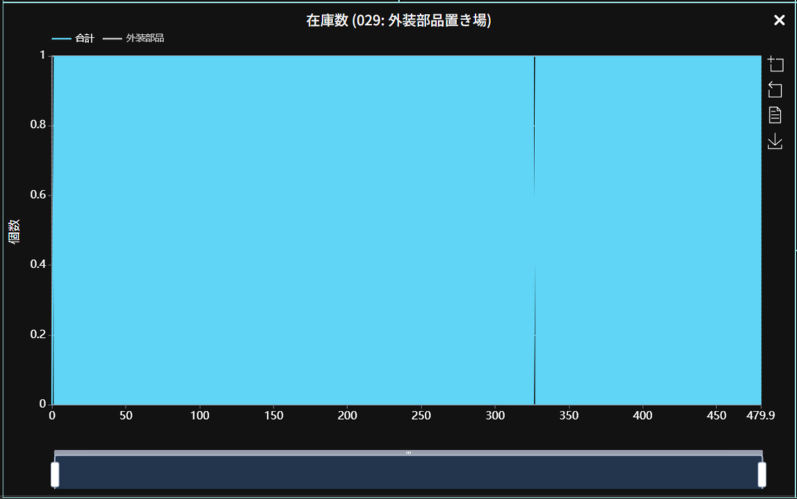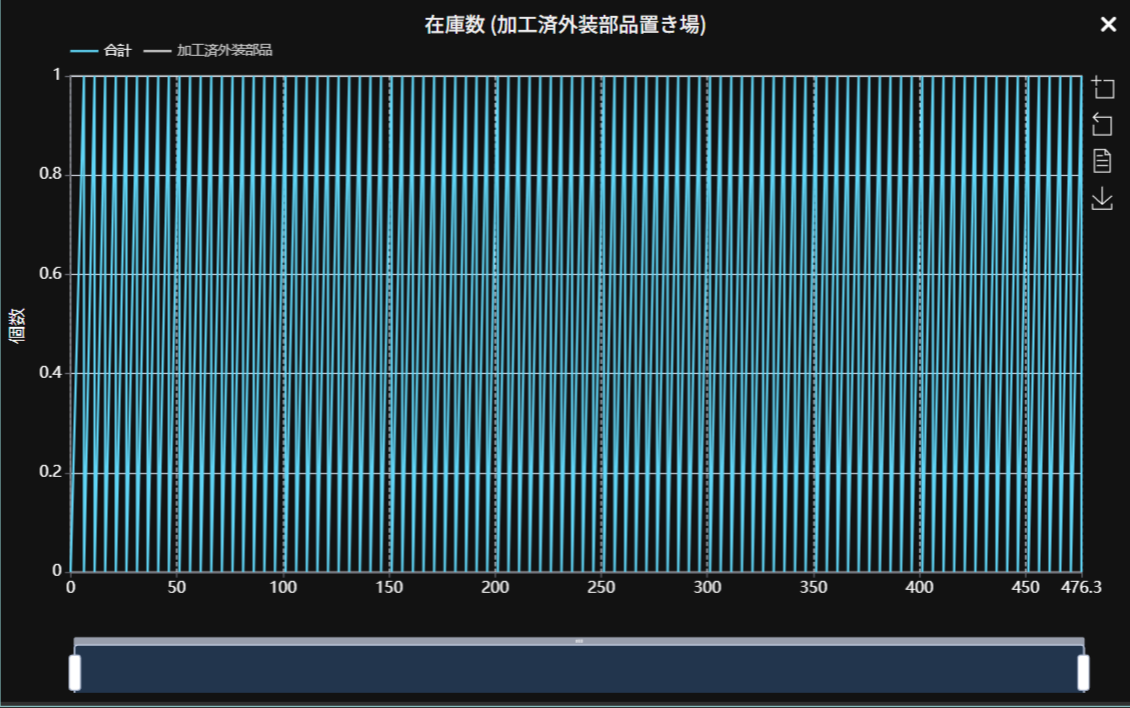 グラフによるとほとんどすべてのの時間でアイドルとなっており、組立能力には不足がないことが分かります。次に「013組立前部品置き場」を確認しましょう。