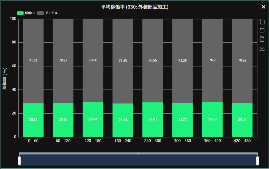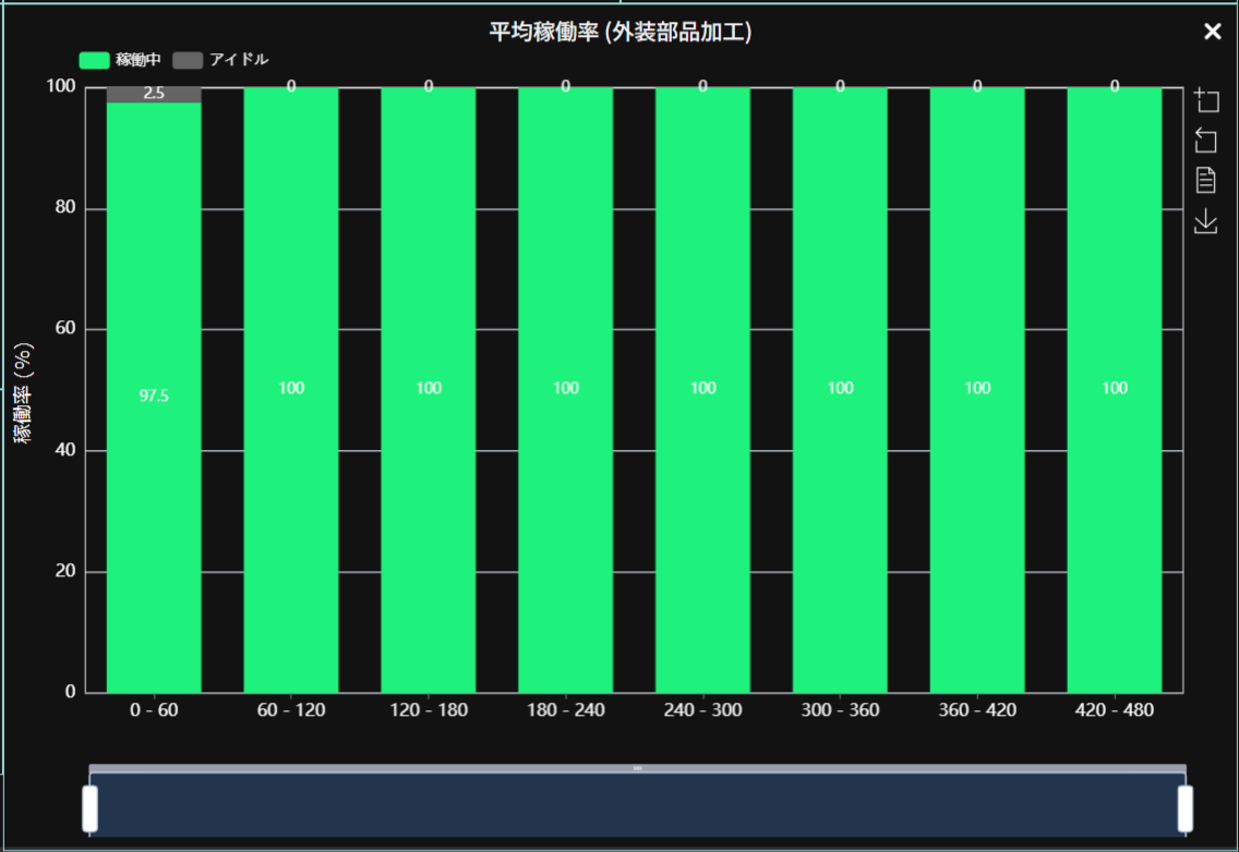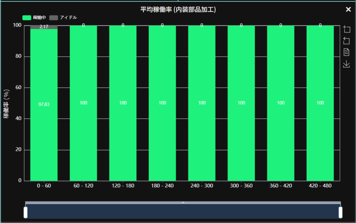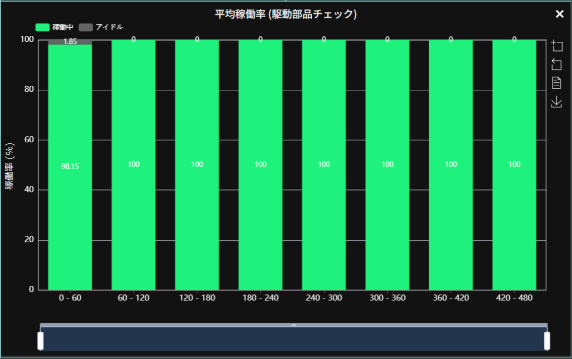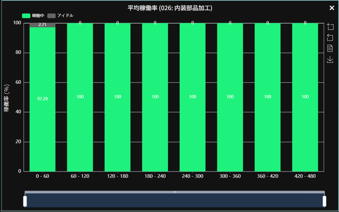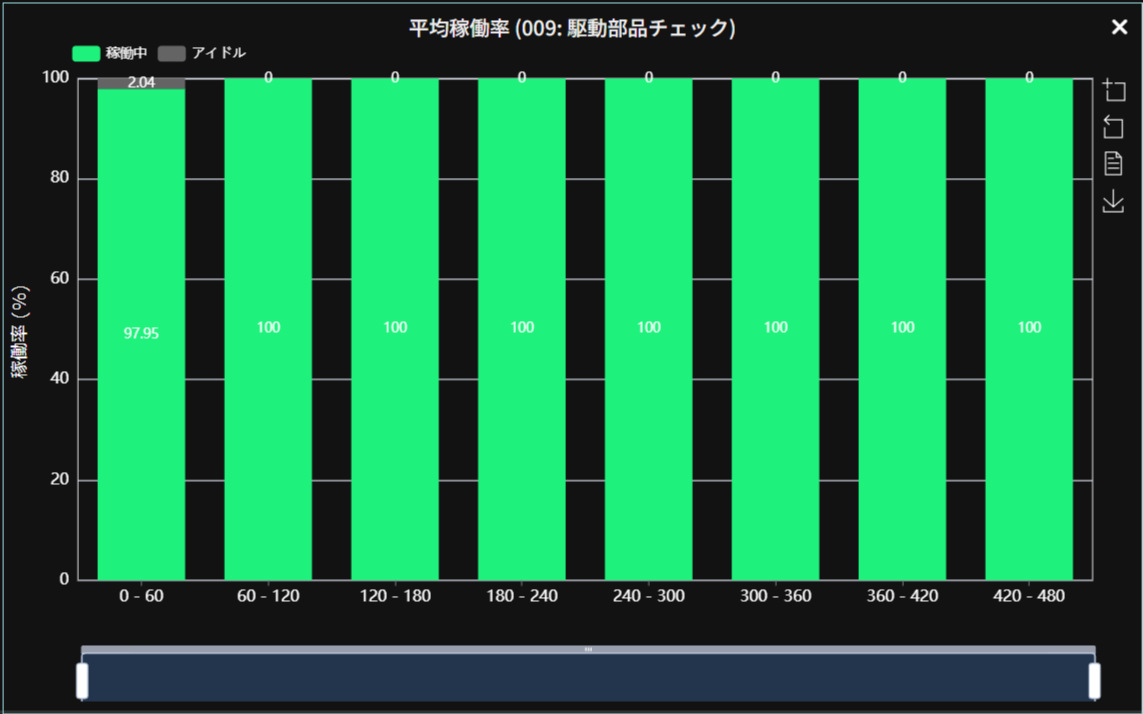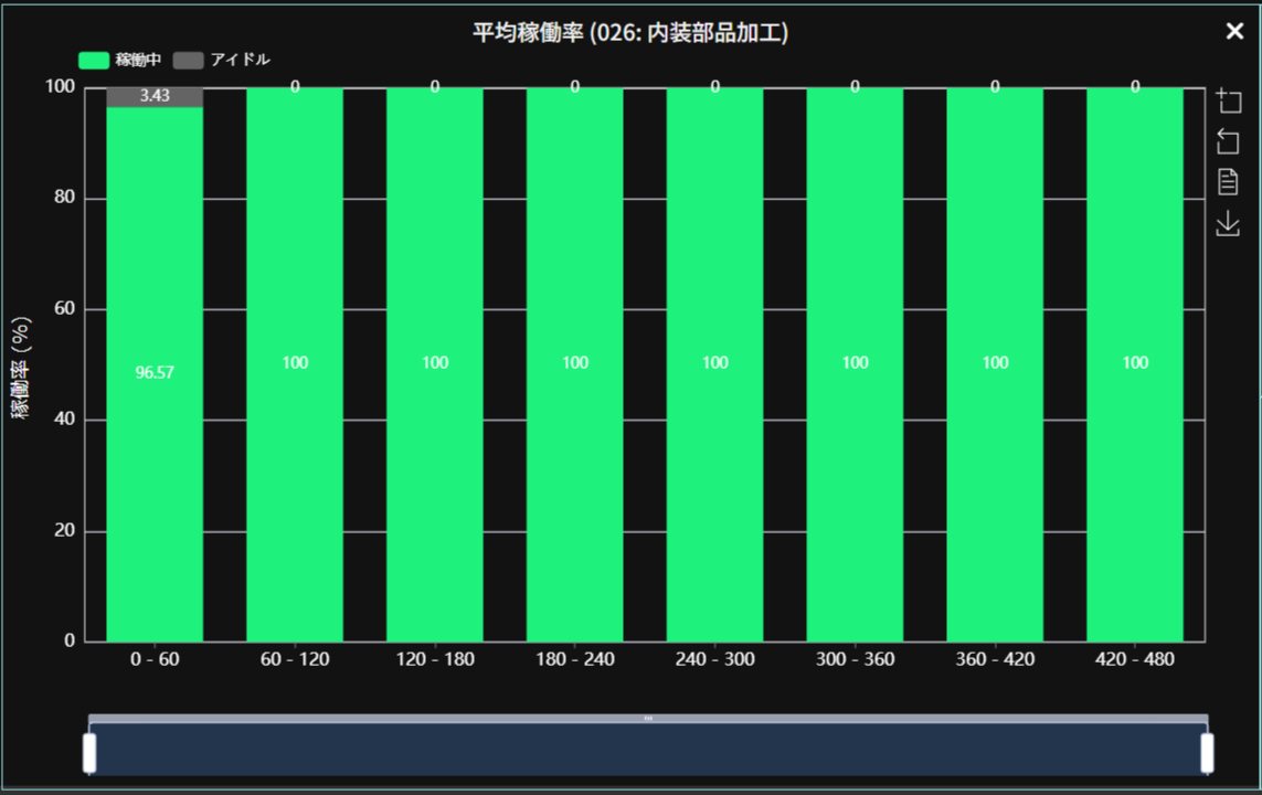 まず、「013組立」を確認してみます。デフォルトではアイテム数推移が表示されますが、グラフ画面の右下をクリックして稼働率推移に切り替えてみましょう。稼働率推移は以下の図のようになります。
