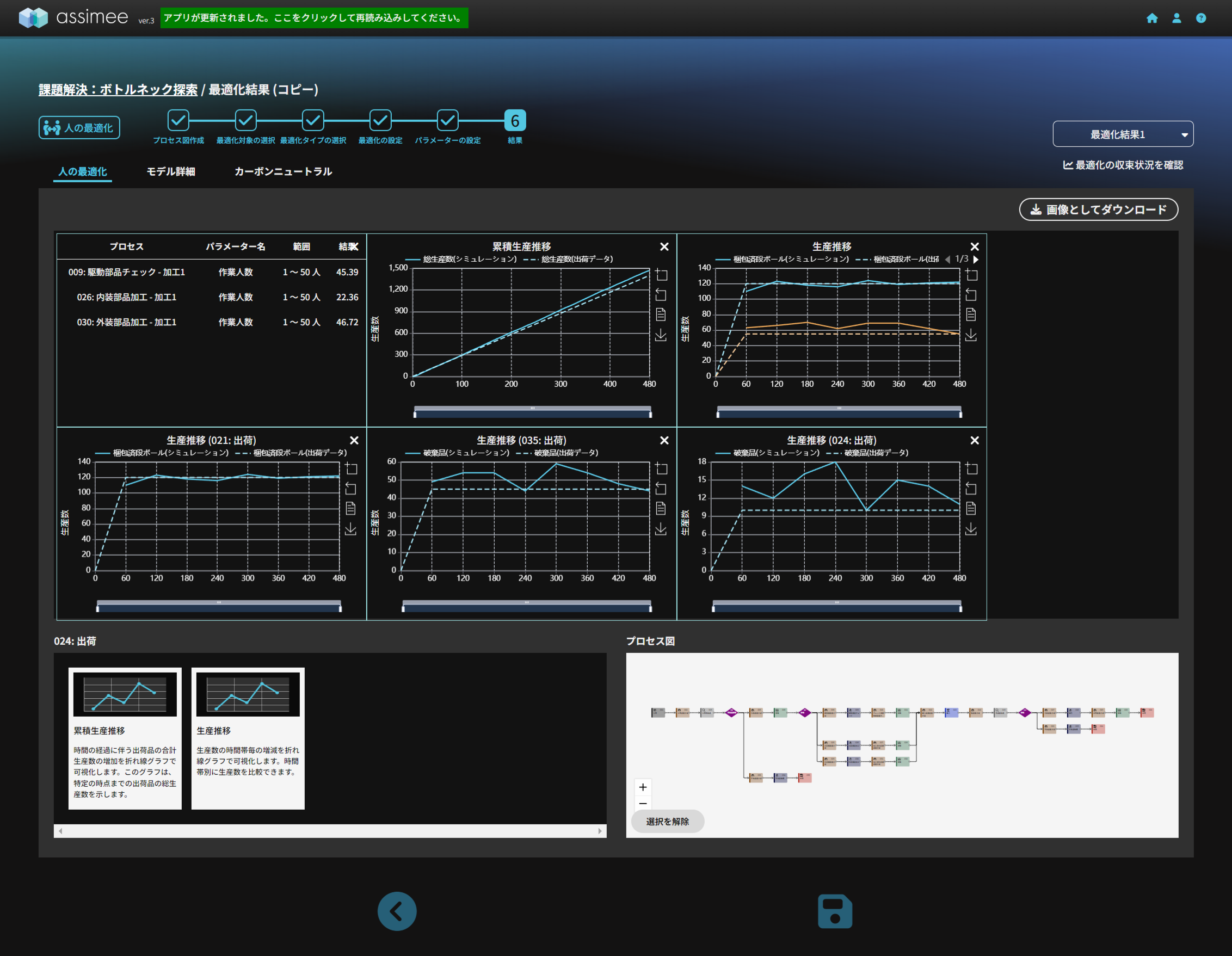 今回はボトルのネックの解消を行う方法について簡単に解説しました。今回は作業人数だけを変更する簡単な例でしたが、assimeeを使うことで、ラインのシミュレーションを行いながらボトルネックとなっているプロセスを探索することで、最適な設定であるかを簡単に検証することが出来ます。