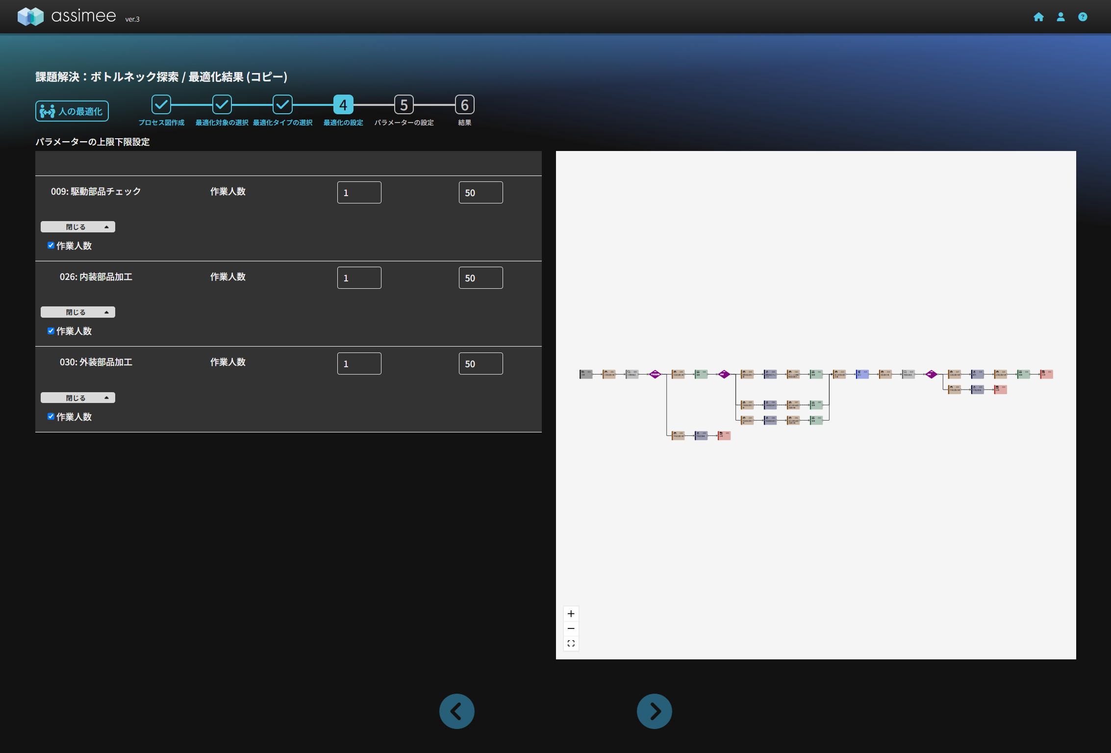 部品供給能力がボトルネックになっていることが分かったので、改善のため3つの加工プロセス「009駆動部品チェック」、「026内装部品加工」、「030外装部品加工」の人員を増やすことを考えます。「人の最適化」を行ってみましょう。今回は「009駆動部品チェック」、「026内装部品加工」、「030外装部品加工」、3つのプロセスの作業人数を対象とし、上限を「50人」に設定します。