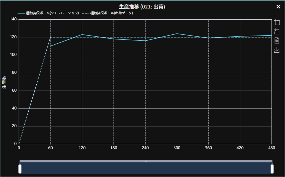 再度シミュレーションを行うと、シミュレーション結果は以下の図の通りで、出荷目標が達成されていることは変わっていません。*不良品率にランダム変数が含まれるため一致しないことがあります。