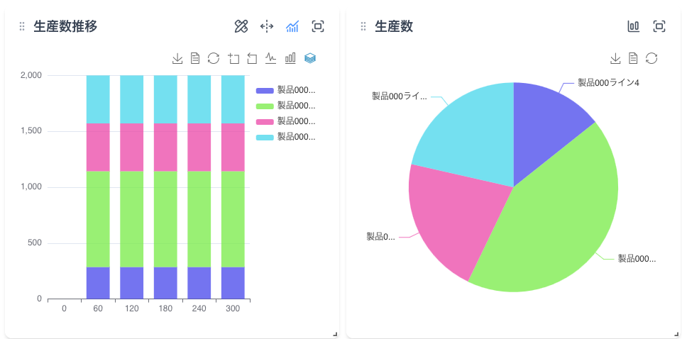 先ほどと同様にラインごとに表示してみると生産数が大きく異なることが分かります。詳細を確認して行きましょう。ダッシュボードから「生産推移」や「生産数」を呼び出し、生産数を確認します。生産割合は「生産割合」から確認することが可能です。今回のモデルでは生産効率の高い「加工ライン1」(緑)が「加工ライン4」(青)の約3倍の数を生産していることが確認できます。