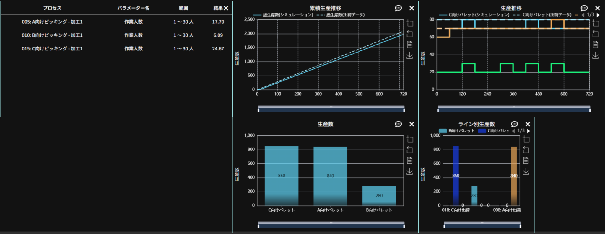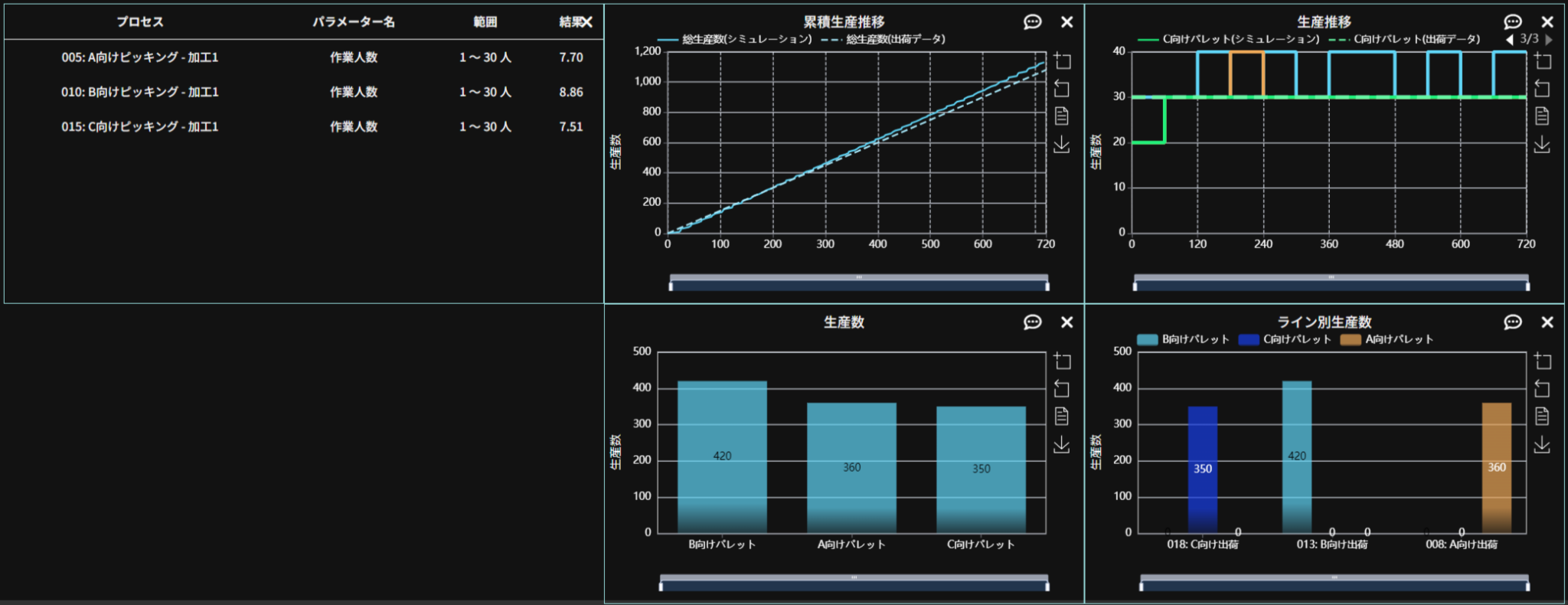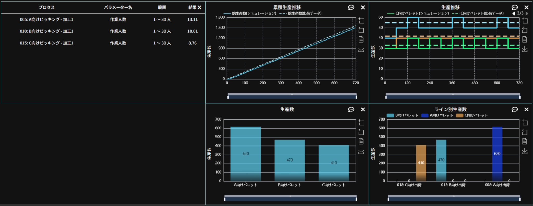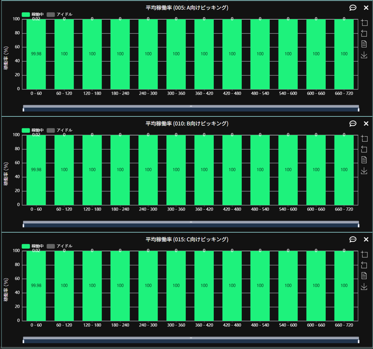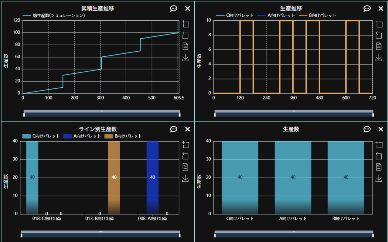 シミュレーション結果は上図のようになりました。A向け、B向け、C向けに対して720分(12時間)で40個ずつのパレットが出荷されています。また、「005A向けピッキング」、「010B向けピッキング」、「015C向けピッキング」の稼働率を見たものが右側の図で、どのプロセスも100%の稼働率となり、ここがボトルネックとなり以上出荷を増やす余裕はないことが分かります。