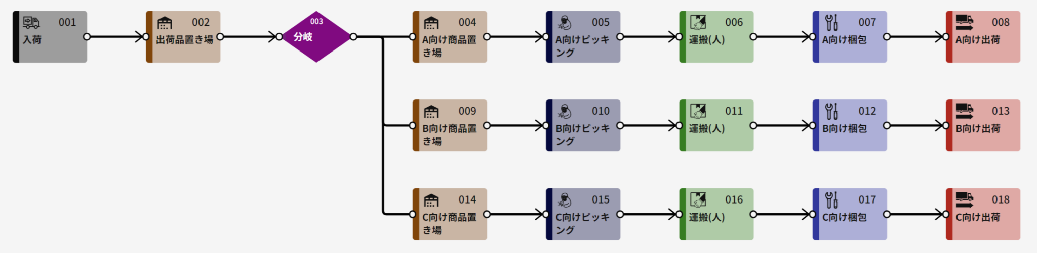 出庫(入荷)した商品を3つの販売店向けに仕分けして梱包し、出荷するだけのシンプルなモデルです。このモデルに対して、出荷目標を複数回変化させ、対応するようにピッキング業務の人の最適化を行い、出荷目標の変化に対して人員数がどう変化するのかについて解説していきます。