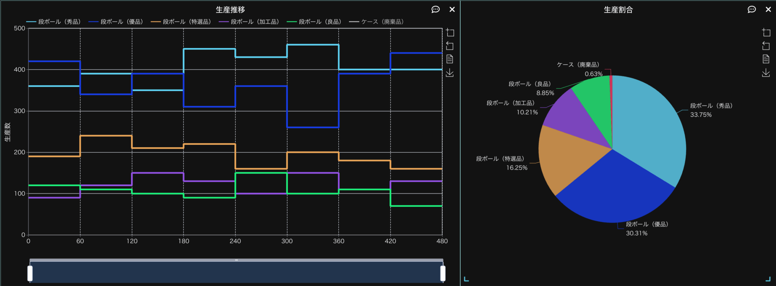モデルの作成とパラメーターの設定が終了したら、シミュレーション時間を8時間に相当する480分に設定してシミュレーションを行います。シミュレーションが終了すると表示されるダッシュボードからシミュレーションの結果を確認するため、「生産推移」と「生産割合」のグラフを選択し表示させたものが下図となります。