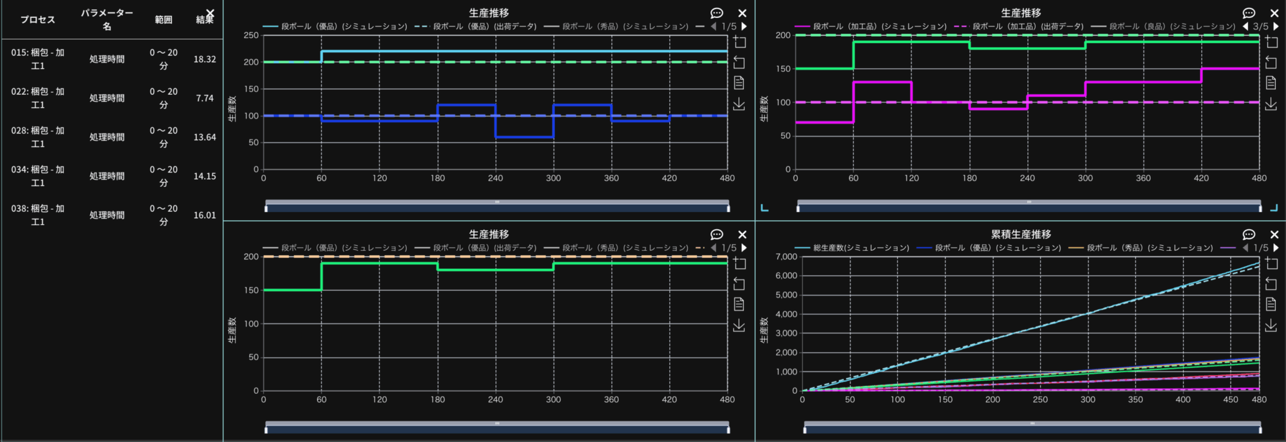 最適化が終了すると以下のようなに出荷目標と実際の出荷量の比較、最適化の結果が表示されます。処理時間が左側のグラフのように変更され、右の図のように出荷目標を達成するようにパラメーターが変更されたことが分かります。