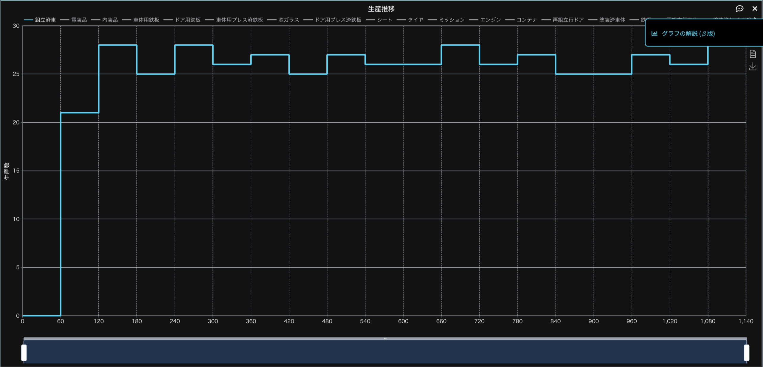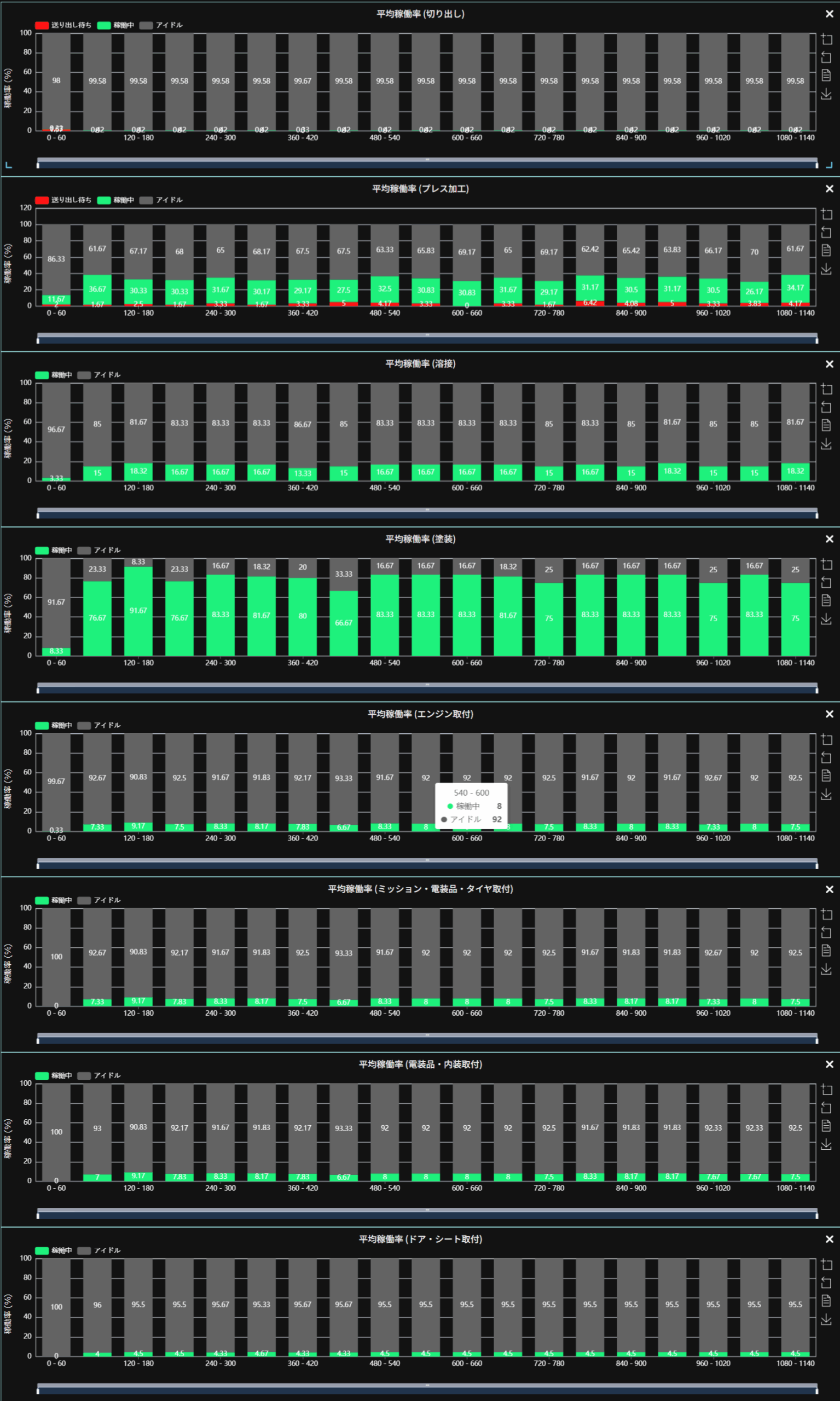 次に、各プロセスのステータス推移をみていくことで、設定したパラメーターに対して、各プロセスが順調に動いているかを判断することが可能です。先ずは自動車の組立に必要な車体の生産に必要な加工プロセスの稼働率を確認してみましょう。いずれの工程も稼働率が100%にはなっておらず、車体の生産には余裕がまだあることが分かります。