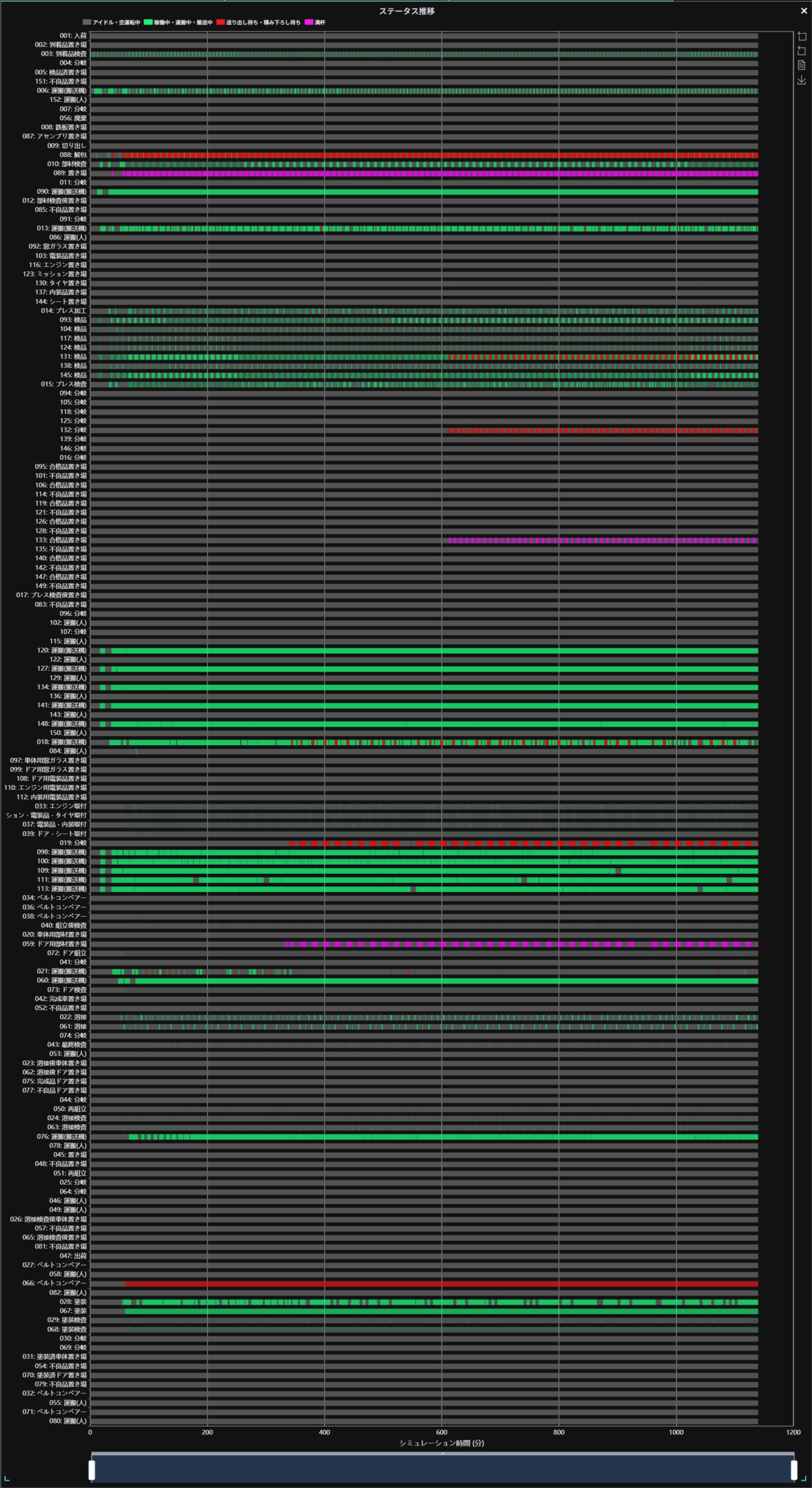 また、全体のステータス推移をみることで、どこかのプロセスに異常が生じていないかを確認することも出来ます。下図のステータス推移図をみると、008解包(内装品などの入荷部分)がブロックを示す赤色となっています。これは直後の009置き場が紫色(容量が一杯)になっていることから、現在の生産ラインの状態ではアセンブリパーツの数が多すぎて処理のボトルネックが生じていることが判明します。同様にして、ドア用の部材も余っていることがわかります。