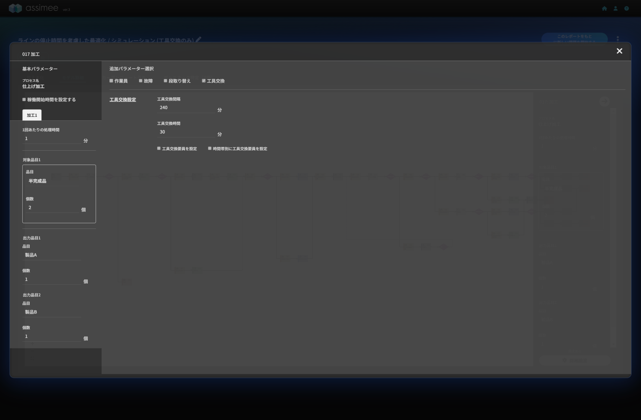 レポート一覧から前回の記事でシミュレーションを行ったモデルを複製します。見える化を選び、最適化の前にシミュレーションを行います。まず、パラメーター設定で、前回使用したモデル(故障時間も工具交換も設定していないモデル)に対して以下のように変更を加えます。
