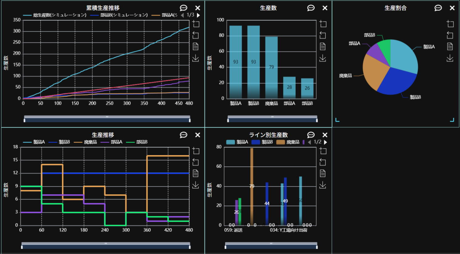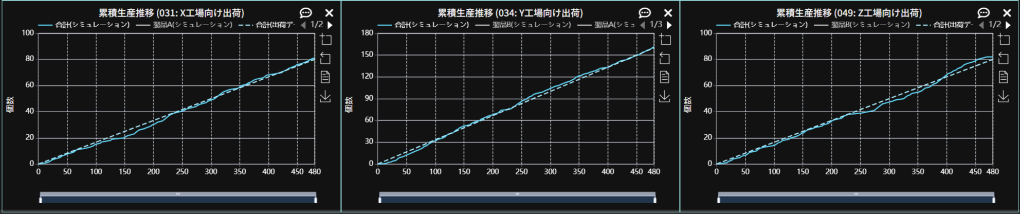 のように小さく変更されて、生産量が増加していることが分かります。製品A、製品Bの出荷目標である20個に対して「生産推移」のグラフを確認すると目標が達成できていることが分かります。3か所の出荷の「累積生産推移」を確認してみましょう。