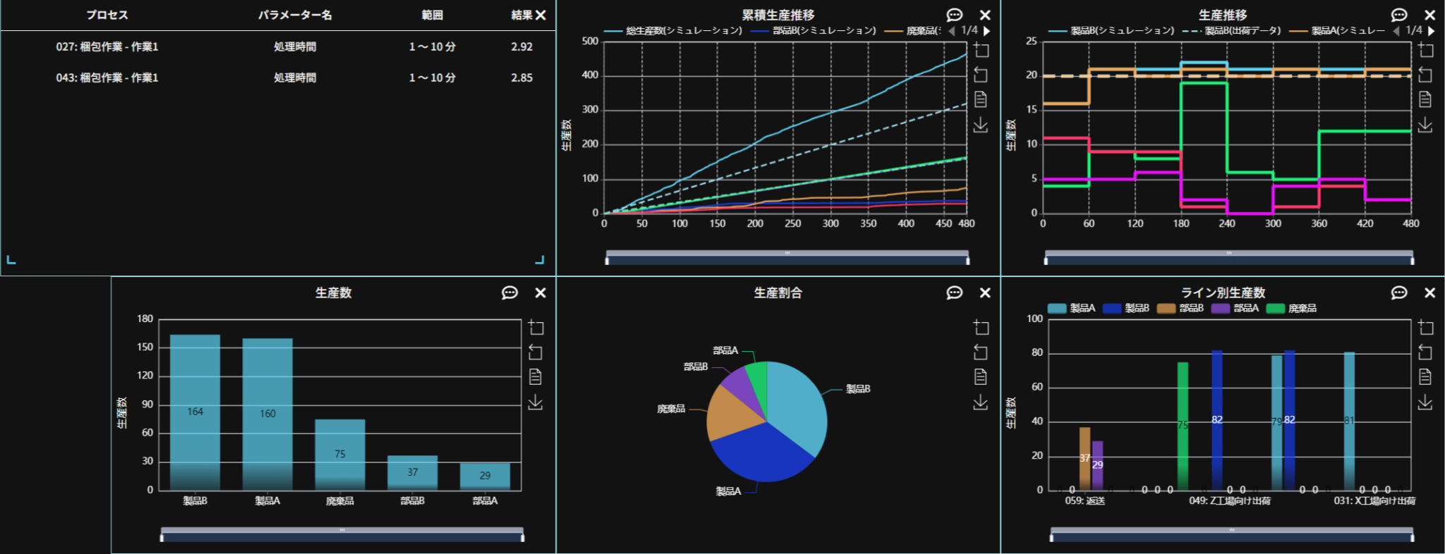 設定が終わったらシミュレーション時間を「480分」に設定してシミュレーションを行います。シミュレーション結果は以下のようになります。*不良品の発生にランダム変数が含まれるため、シミュレーション結果が一致しないことががります。