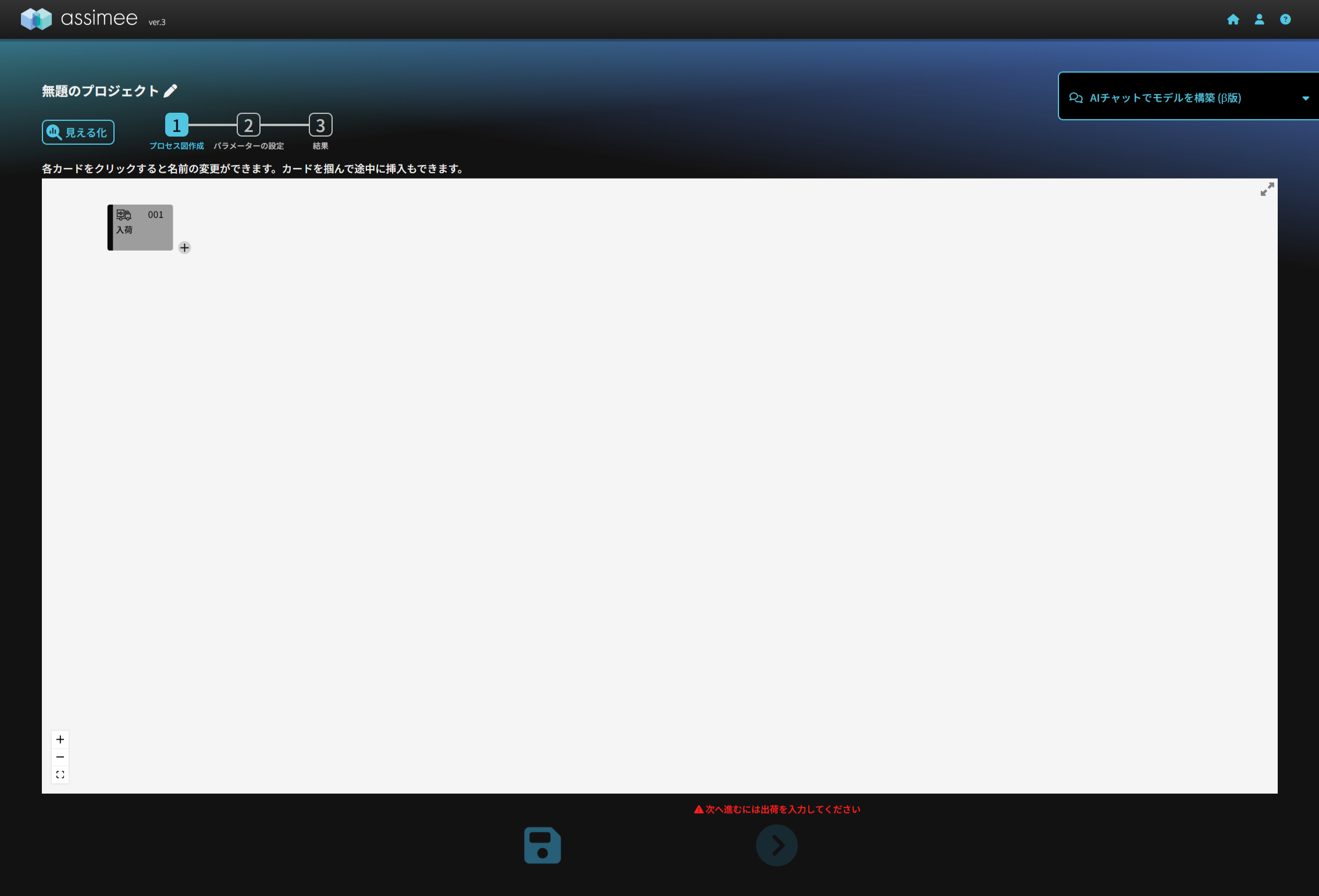 生成AI(LLM)を使用するには、通常通り新しいモデルの作成から始めます。モデルの作成画面(STEP1 プロセス図の作成)で、右上にAIとのチャット用のプロンプトが表示されています。これをクリックすると、チャット入力画面が表示され、生成AIと対話しながらモデルを作成することができます。この機能により、自然言語での指示を通じて、より効率的にモデルを構築することが可能になります。