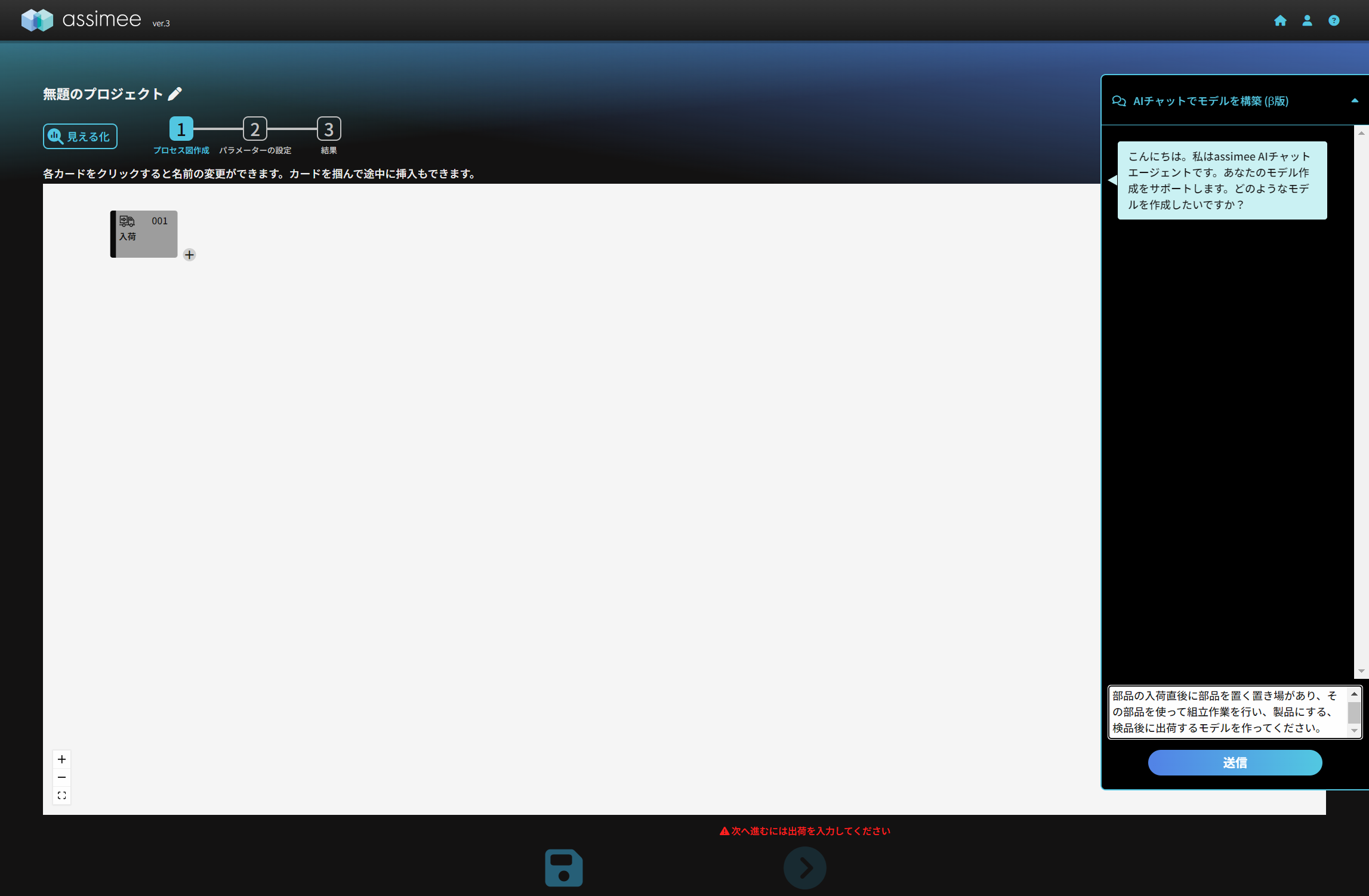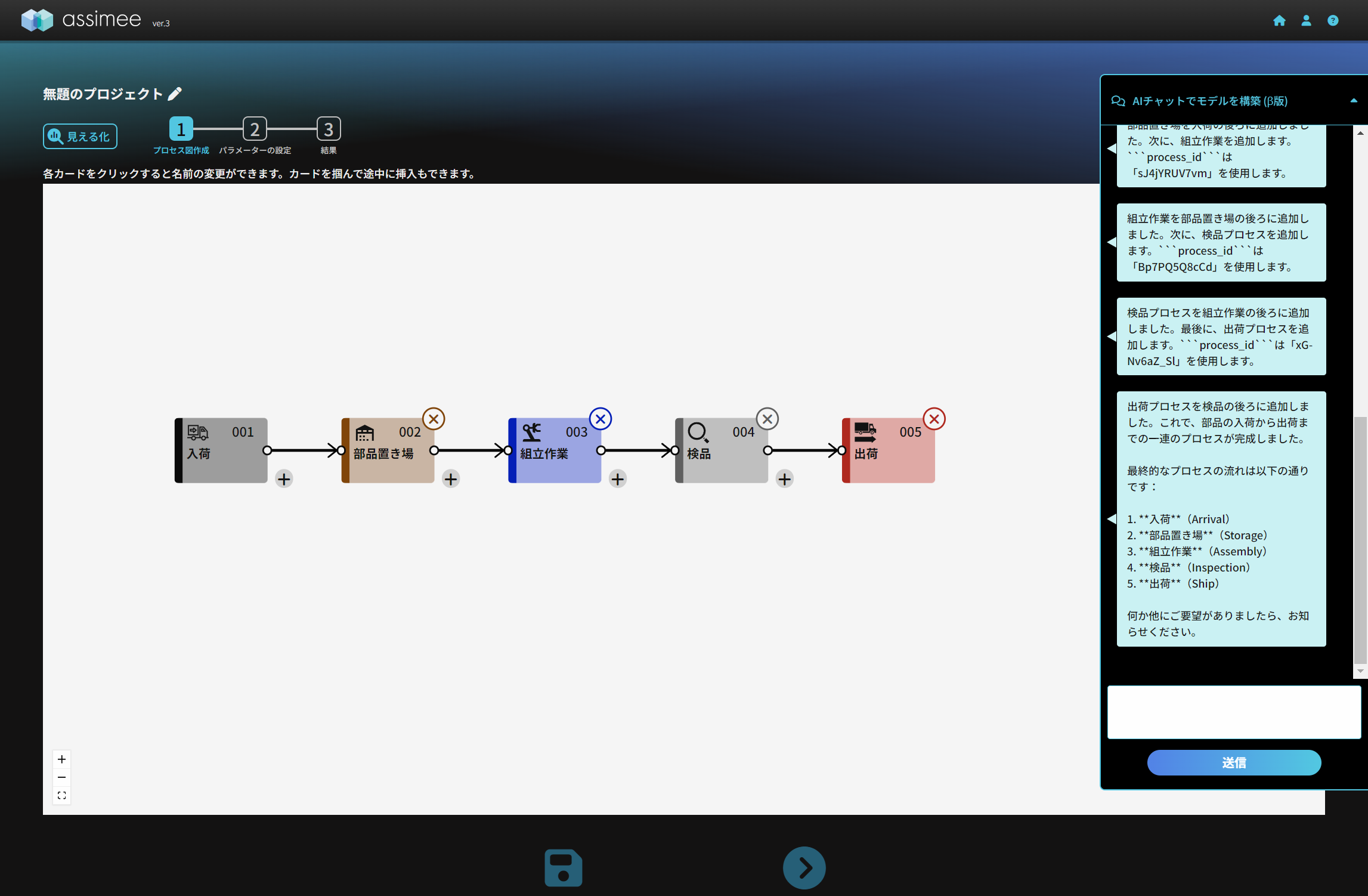 なお、チャットには出来るだけ正確にモデルを解説することで、正確さが向上します。例えば、上記のプロンプトで「その部品を使って組立作業を行い、製品にする、検品後・・・」と入力しましたが、「その部品を使って組立作業を行い、検品後・・・」とすると、希望している組立プロセスが作業プロセスで構築されたりするので、注意してください。