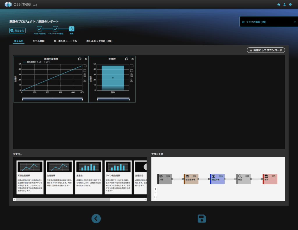 今回の記事では、新たにassimeeに実装された生成AI(LLM)を用いたモデルの自動構築機能と、シミュレーション結果に基づいたボトルネック推定機能について簡単に解説しました。この機能により、自然言語でのやり取りのみで生産ラインのシミュレーションモデルの作成や分析が可能となり、生産現場のDX(デジタルトランスフォーメーション)を実現できます。これにより、従来は専門知識や手作業が必要だったプロセスが簡略化され、効率的な生産ラインの最適化が期待できます。