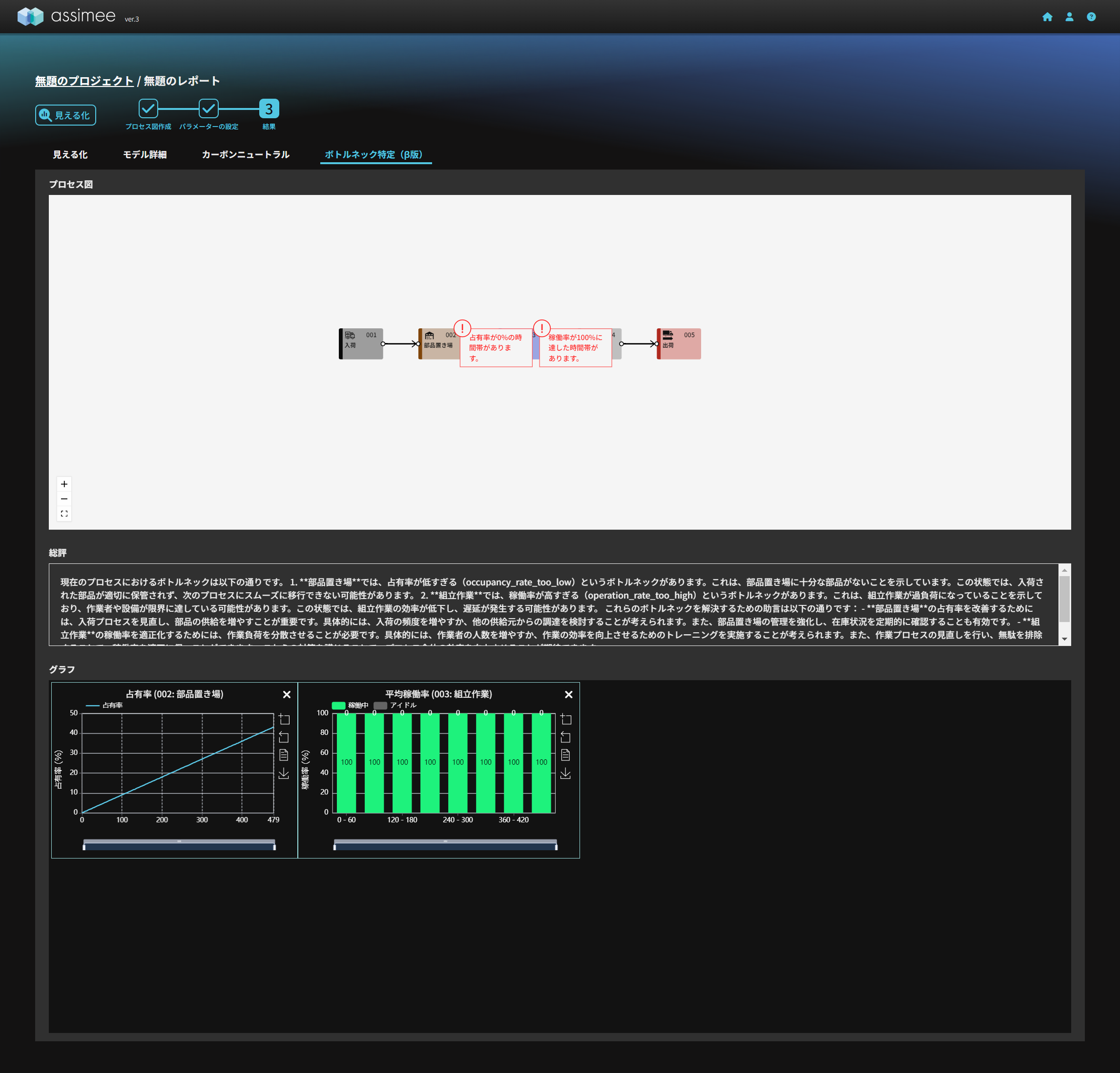 AIによるシミュレーション結果の分析が行われ、占有率が大きい置き場や稼働率が高い組立プロセスがボトルネックとして推定されました。この時、画面の下側には分析内容に関連したグラフが自動的に表示されるため、視覚的に状況を把握することができます。この機能を活用することで、これまでのように専門的な分析ノウハウが作業者に求められたボトルネック推定を自動で行うことができ、業務の効率化につながります。