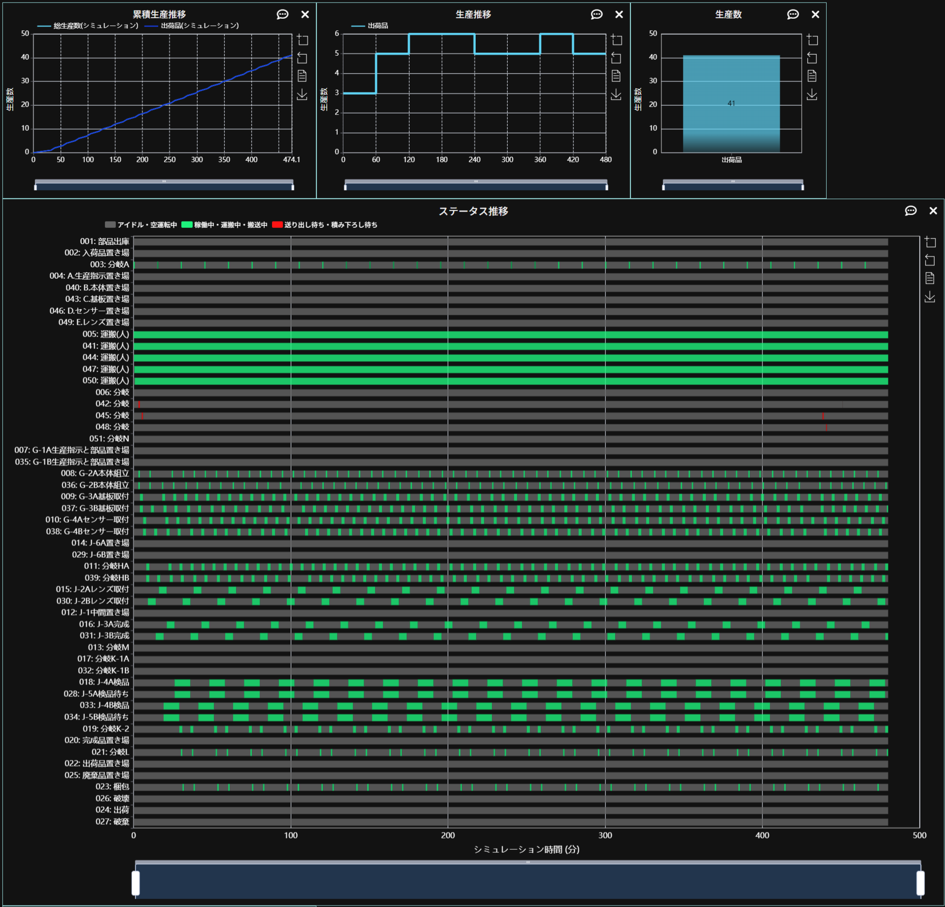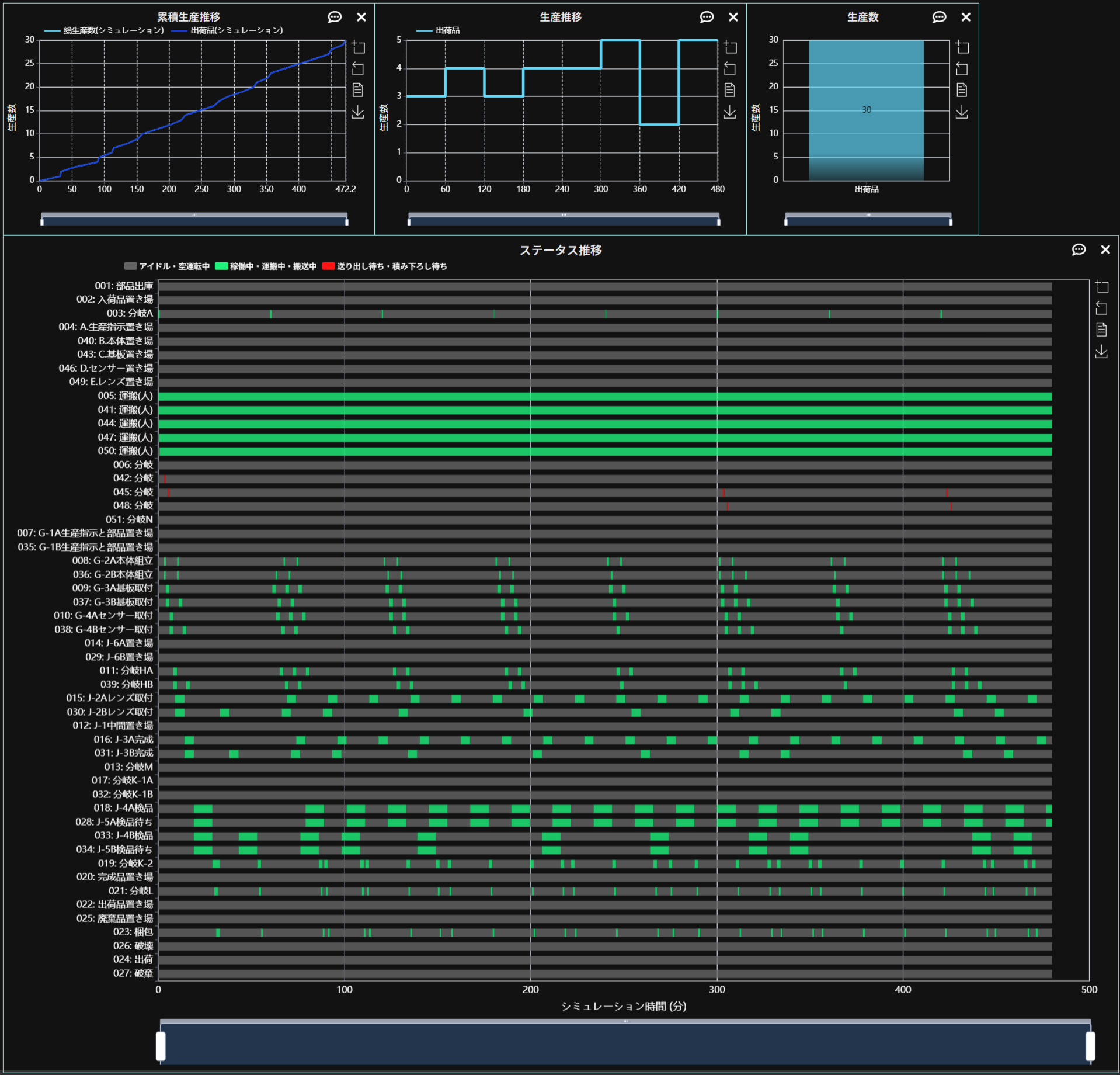 先ほどの30分間隔シミュレーションとほぼ同じ結果になっていることが確認できます。これにより、このモデルで生産数をさらに増やすには、単に入荷量を増やすだけでなく、ライン数の増加や処理時間の短縮などの対策が必要であることがわかります。また、処理時間の長い下流側のセルに対しても対策が必要です。