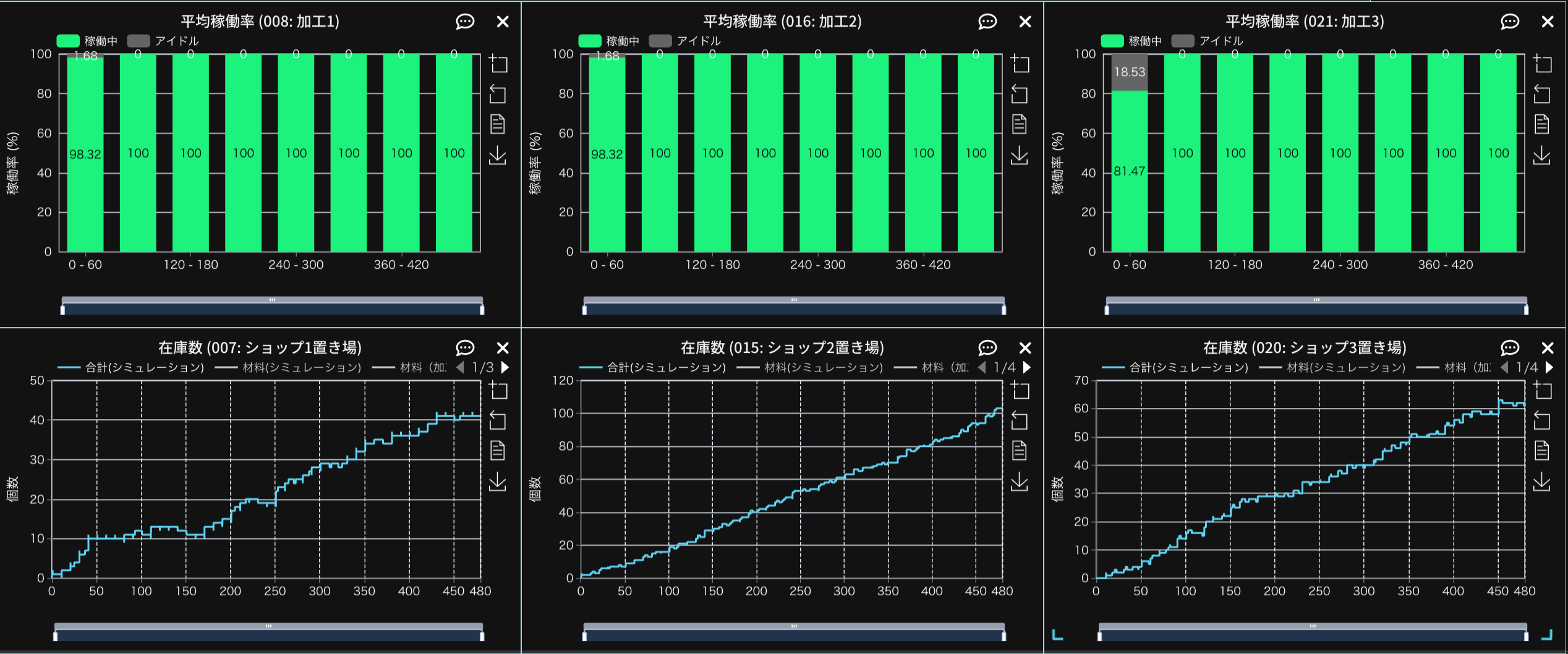今回のシミュレーション結果から、ランダムショップ型の方がやや生産量が多くなり、各ショップを平均すると稼働率がやや高くなることが確認されました。ランダムショップ型の方が無駄なく設備が活用されていると言うことができます。一方で、各ショップで在庫が増加してしまう点も「見える化」されました。これは、効率性と在庫管理の間でトレードオフが生じることを示しています。