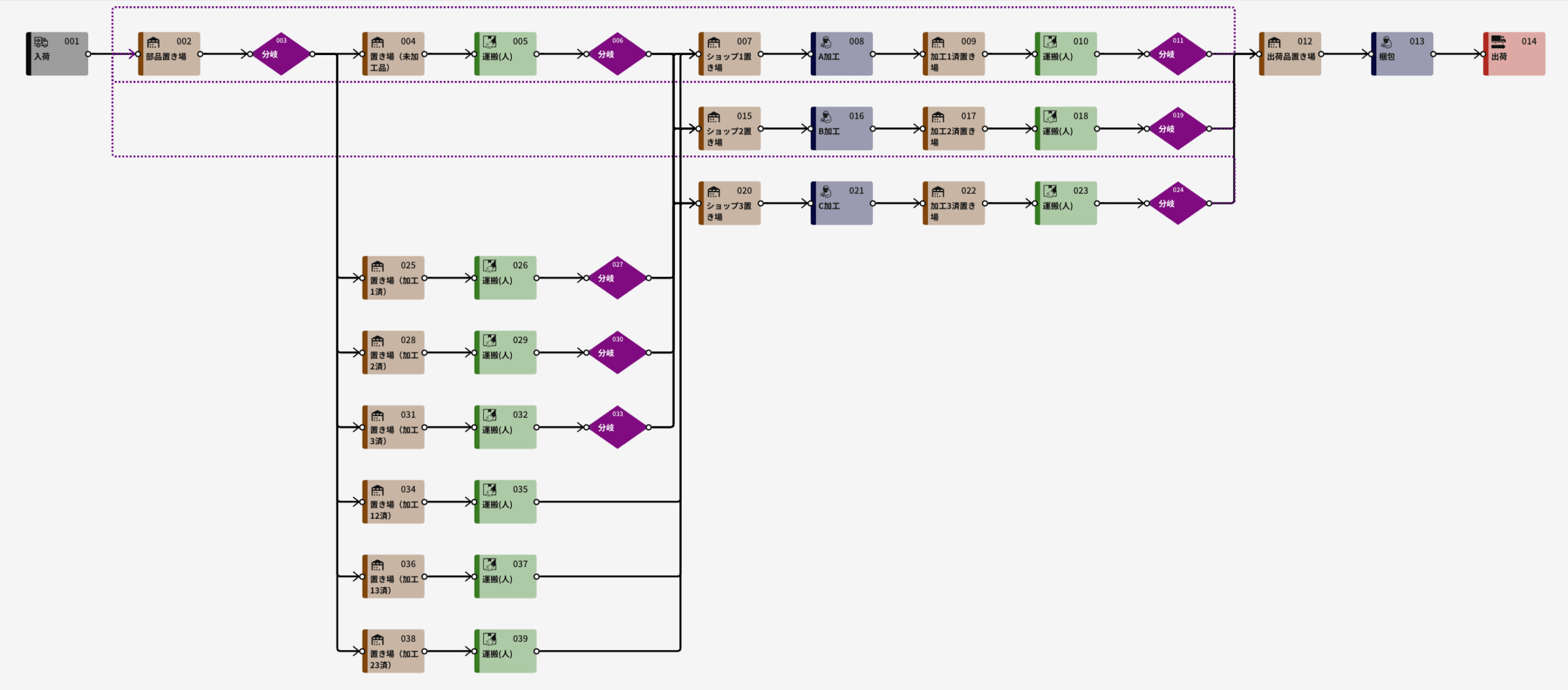 それぞれの加工時間を同一に設定した上で、これら2つのモデル(ランダムショップ型とフローショップ型)の生産量にどのような差が生じるか、シミュレーションで確認してみましょう。