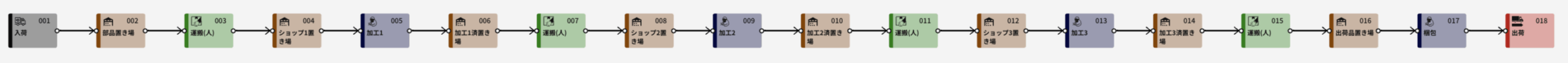 上流から加工を順番に行うフローショップ型の生産ラインを先ほどのランダムショップ型と同様になるようにモデル化すると、以下のようになります。