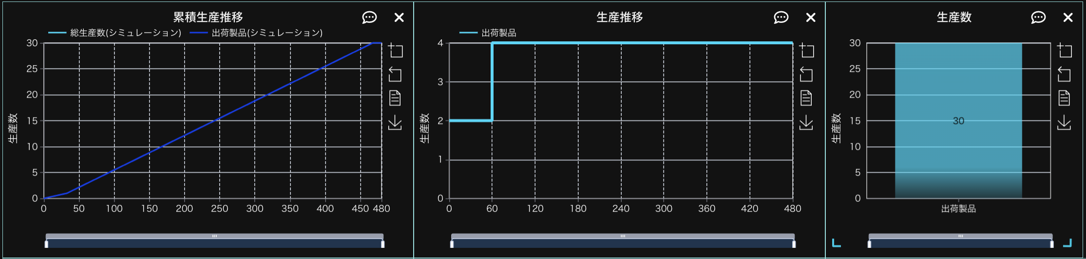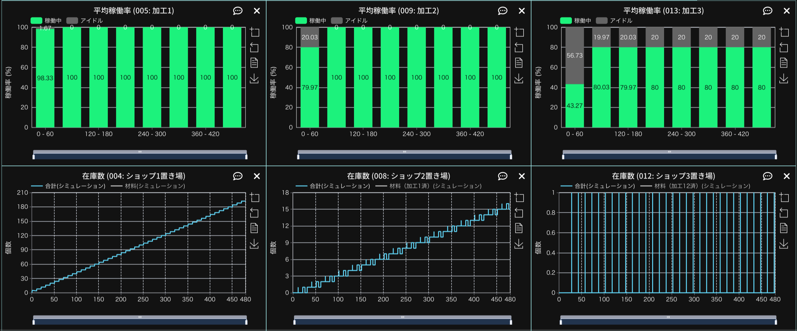 モデルの作成が完了したら、次にシミュレーションを行います。2つのモデルについて、シミュレーション時間を480分に設定して実行しました。