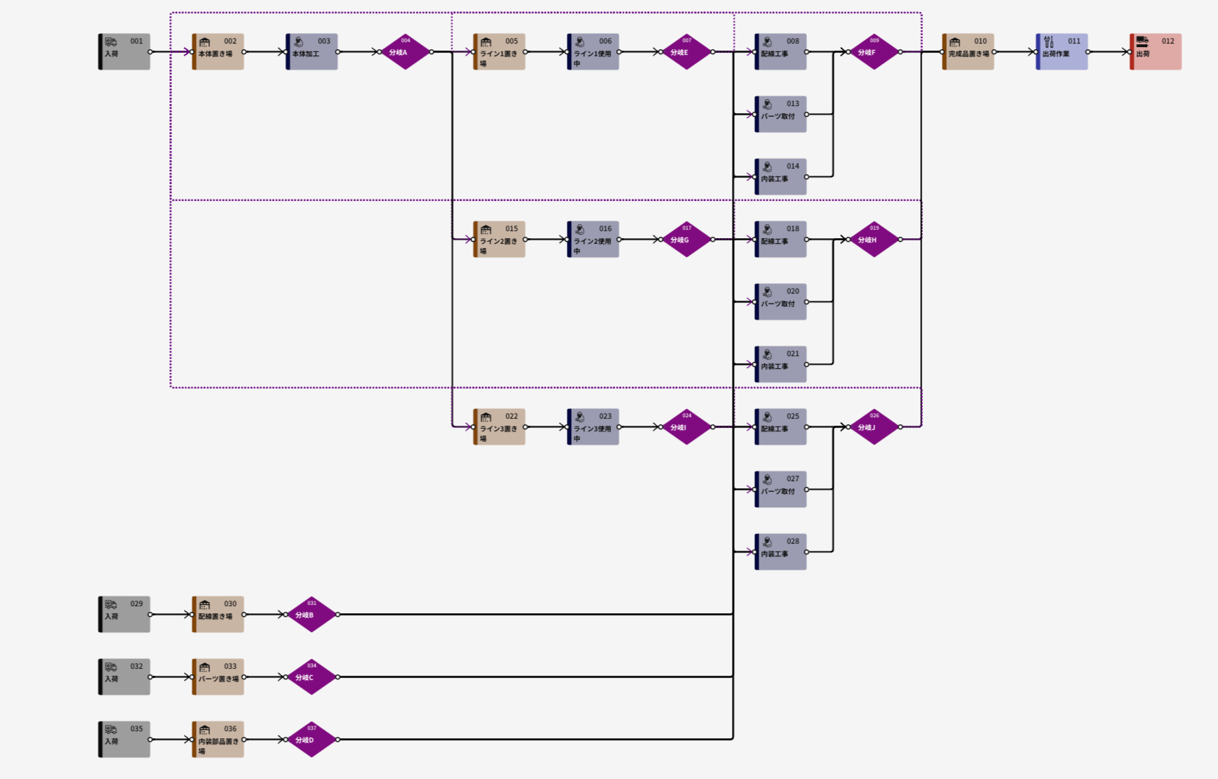 今回は、据え置き型生産方式のシミュレーション(見える化)方法について解説しました。また、複数のラインで生産が順番に行われる仕組みや、ライン内での組立工程がランダムに進む設定を加え、想定通りに動作していることを確認しました。assimeeでは、用意されたプロセスカードを自由に組み合わせることで、実際の生産工程を簡単かつ柔軟に再現できます。