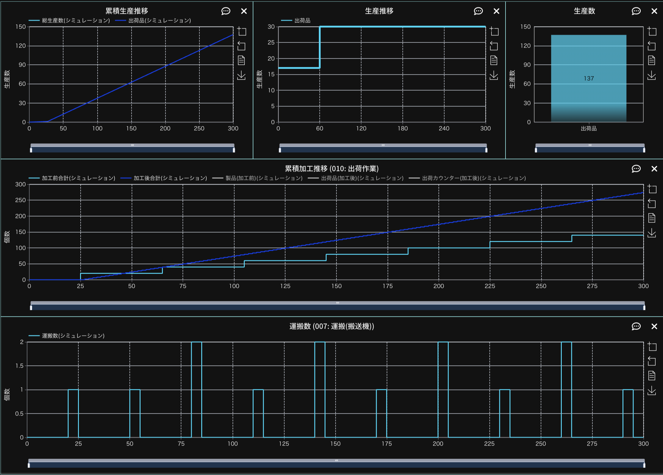シミュレーションの結果、どのシナリオでも生産停止などの大きな問題は発生しませんでした。生産数(出荷数)と搬送回数に注目すると以下のようになります。