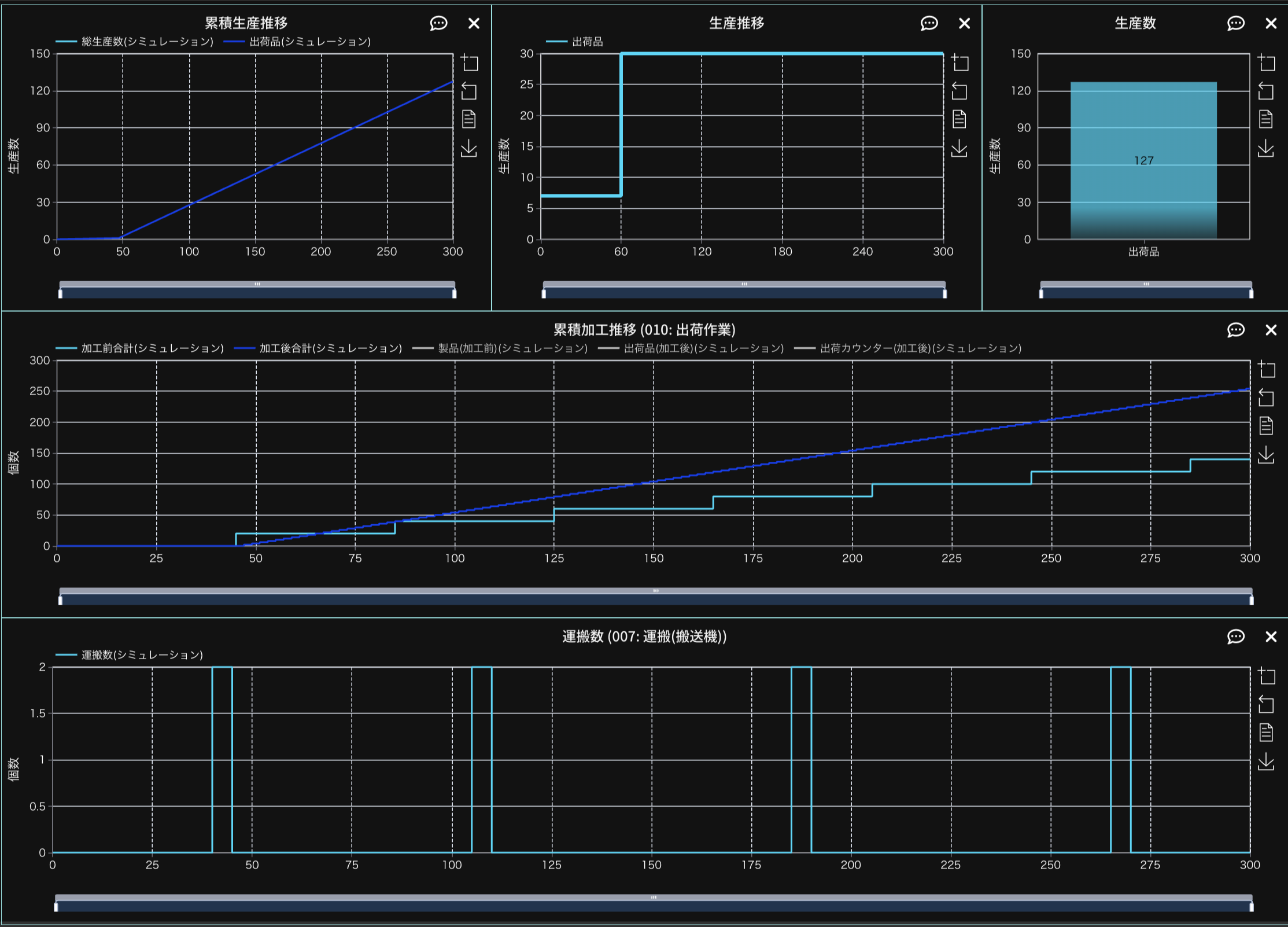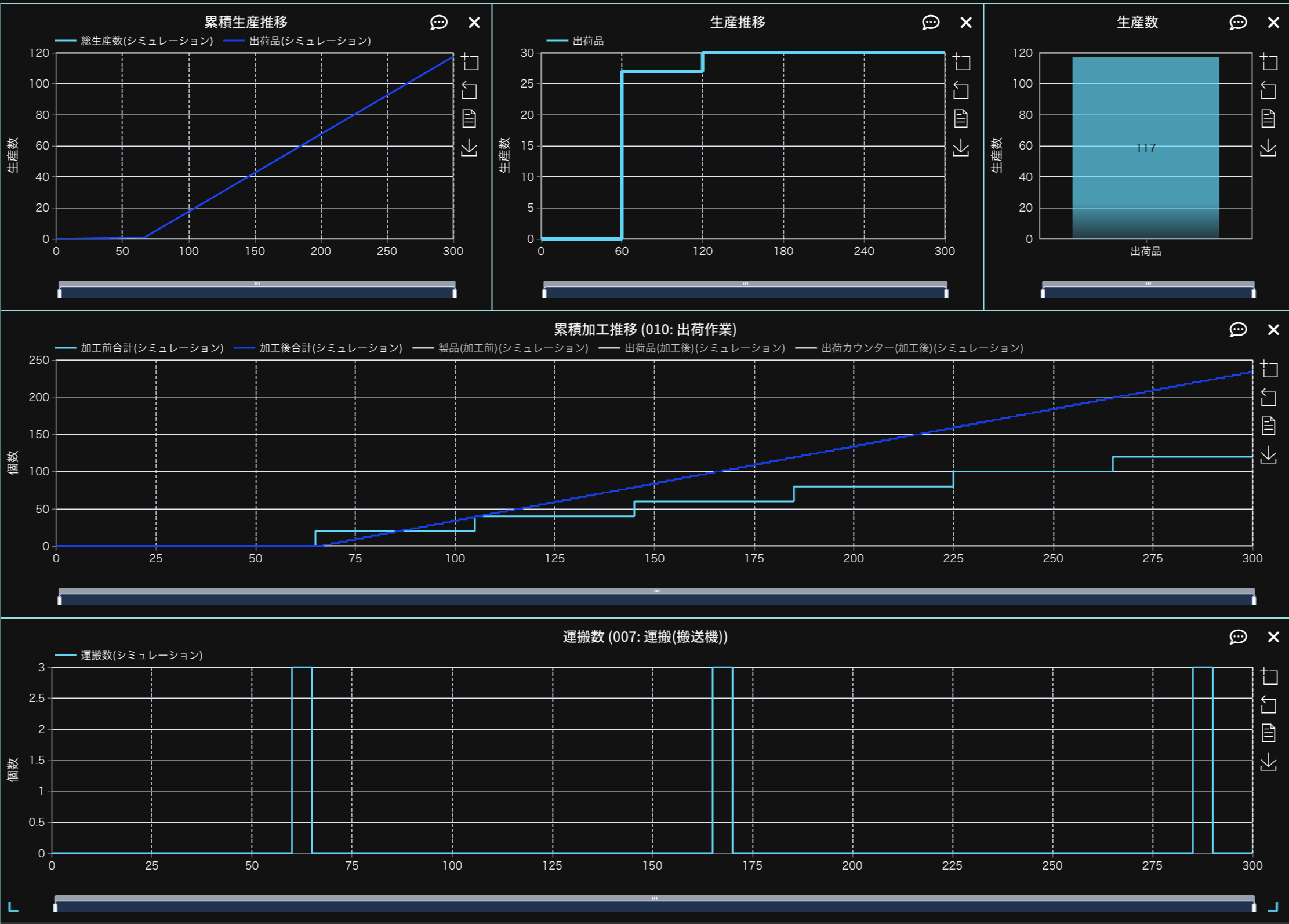 出荷数に注目すると、シナリオ1 > シナリオ2 > シナリオ3 の順になります。これは、バッチ搬送では1バッチ分の製品が貯まるまで時間がかかるため、搬送や出荷のタイミングが遅れ、結果として出荷数がやや減少するためです。