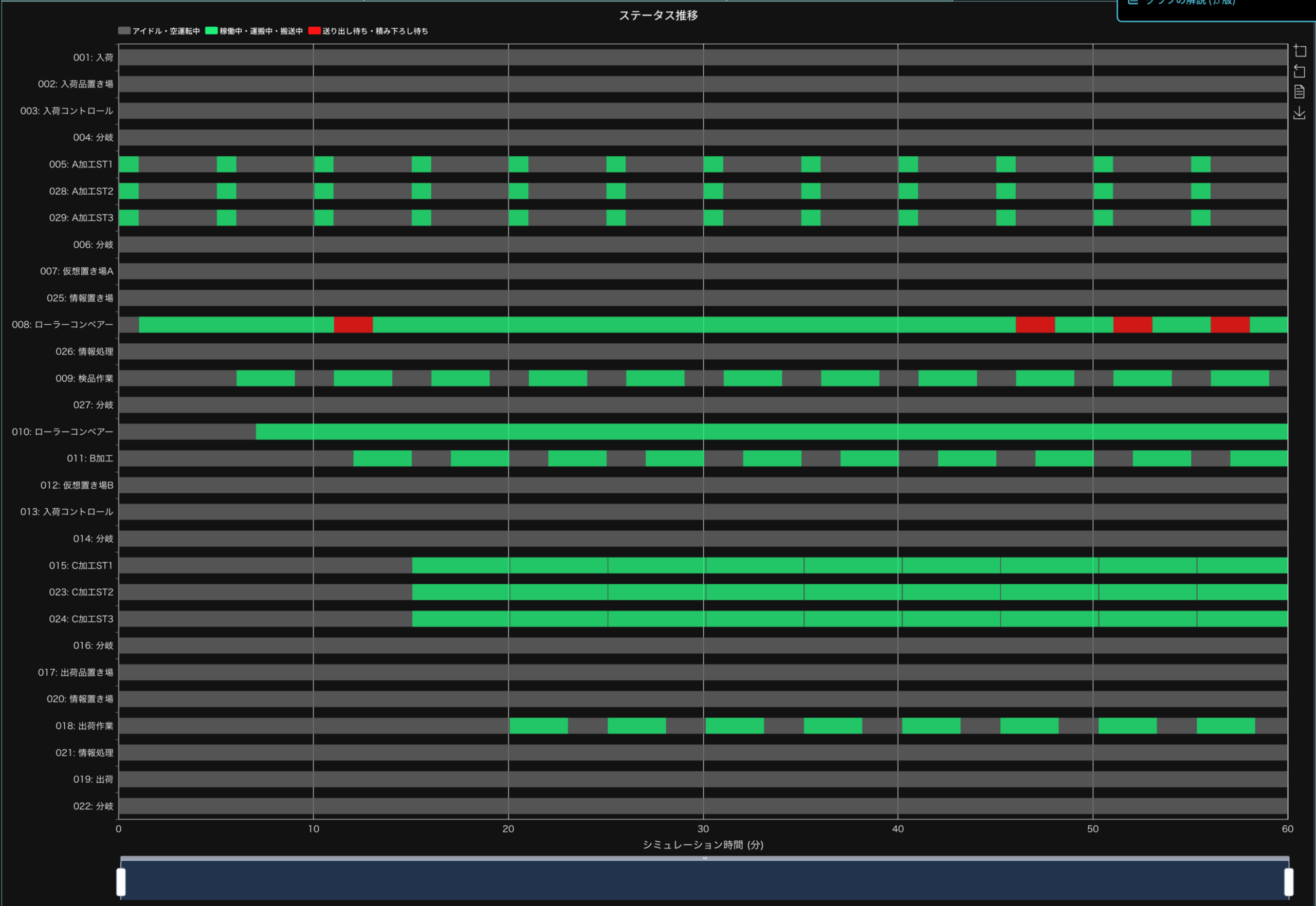 モデルが完成したらシミュレーションを行います。今回はバッチ処理の結果の確認を行いやすいようにシミュレーション時間を短めの60分と設定して行いました。