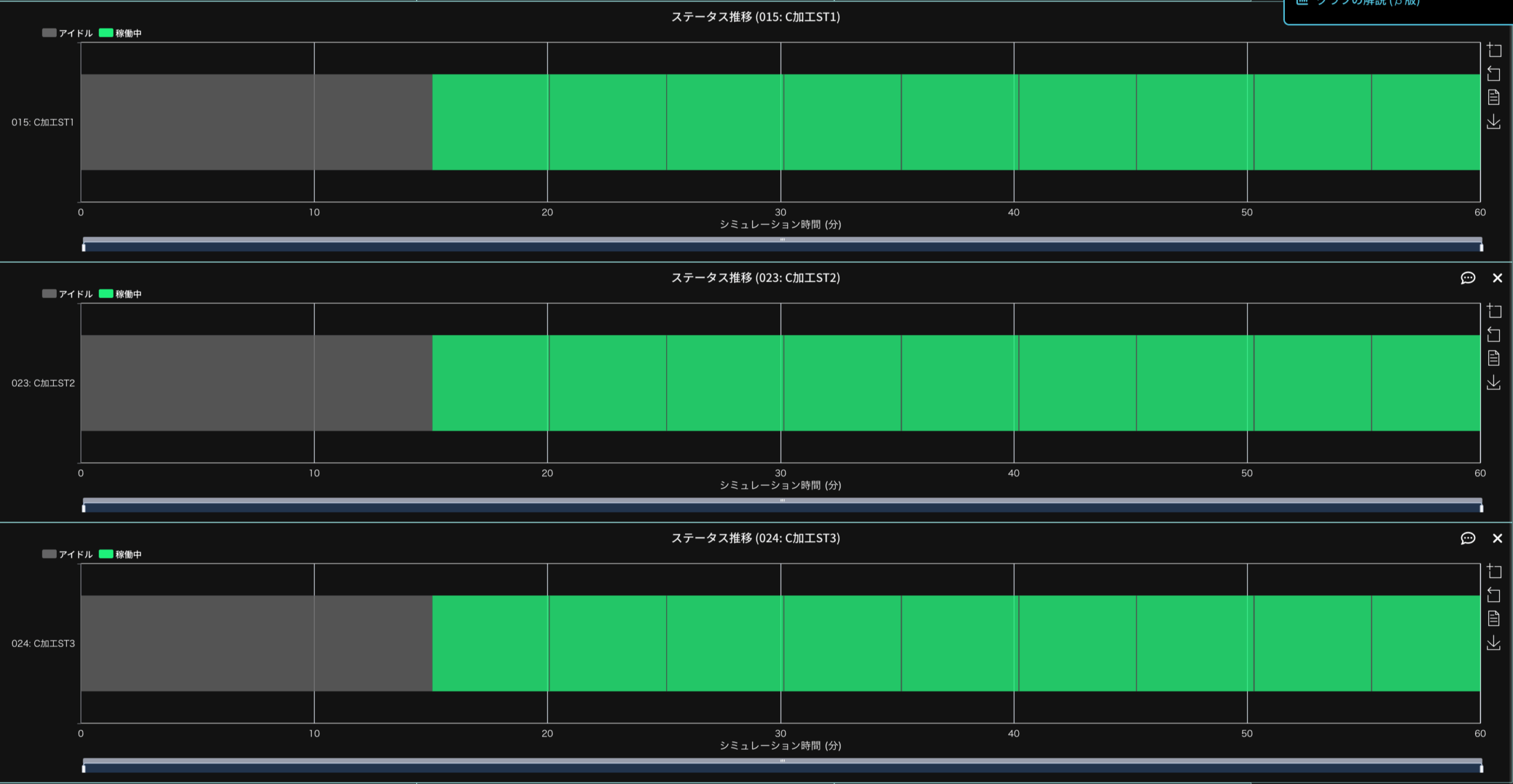 3つのSTでの処理時間5分での加工が完全に同期して行われていることがわかります。