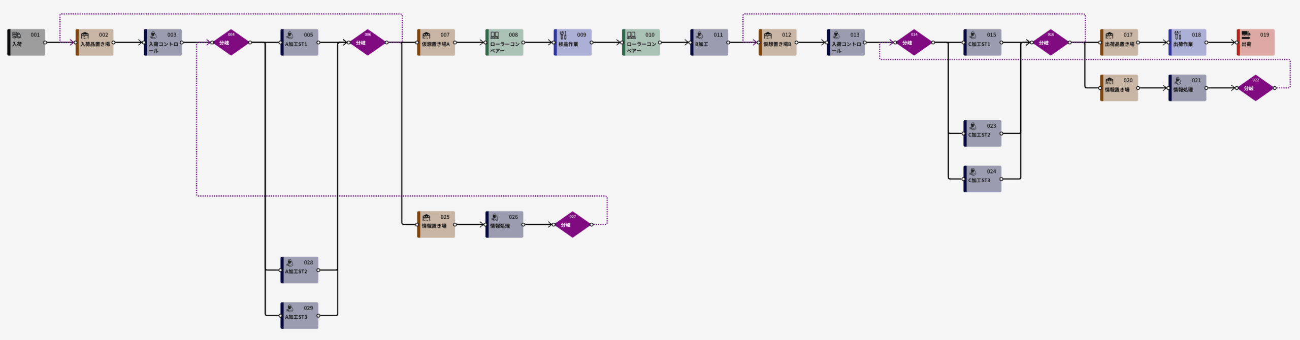 assimeeでこのモデルを再現するには、バッチ数に対応した数の加工プロセスカード(図中でSTと表現)を用意し、各STが埋まった際に情報を発行し、バッチ分の情報が揃った時点で同期処理を実行するために情報を上流側にループで戻すように設定する必要があります。また、奥側を優先してワークを整然と配置するため、加工プロセスへ入荷するワークにタグを付与し、適切にコントロールします。作成されたモデルを確認すると通常の工程に情報処理と情報のループが追加されていることがよくわかります。