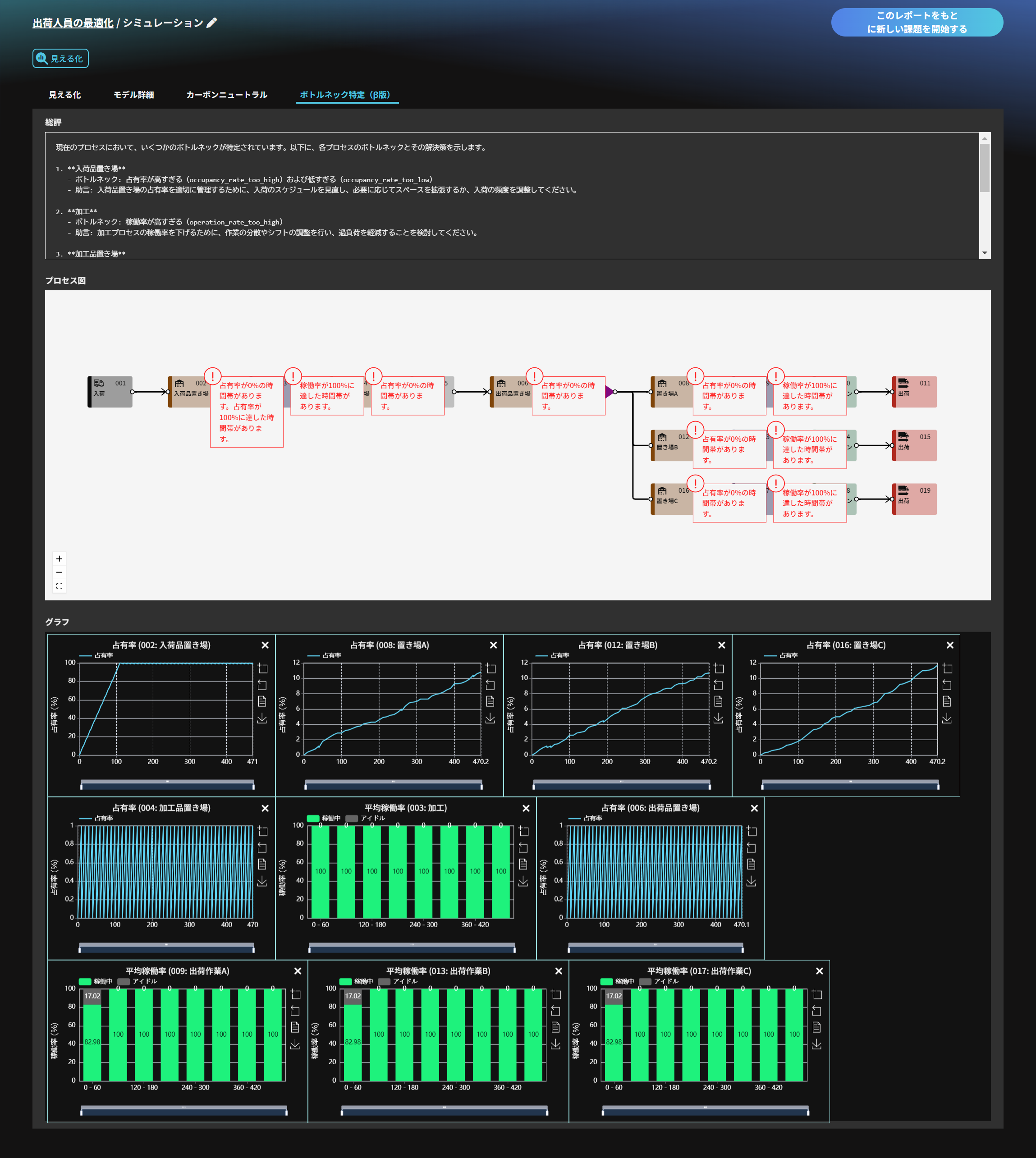 シミュレーション結果をAIが分析して、ボトルネックが発生して居そうな場所を推定し、モデルの総評、プロセス毎の分析結果、対応するグラフを表示してくれます。