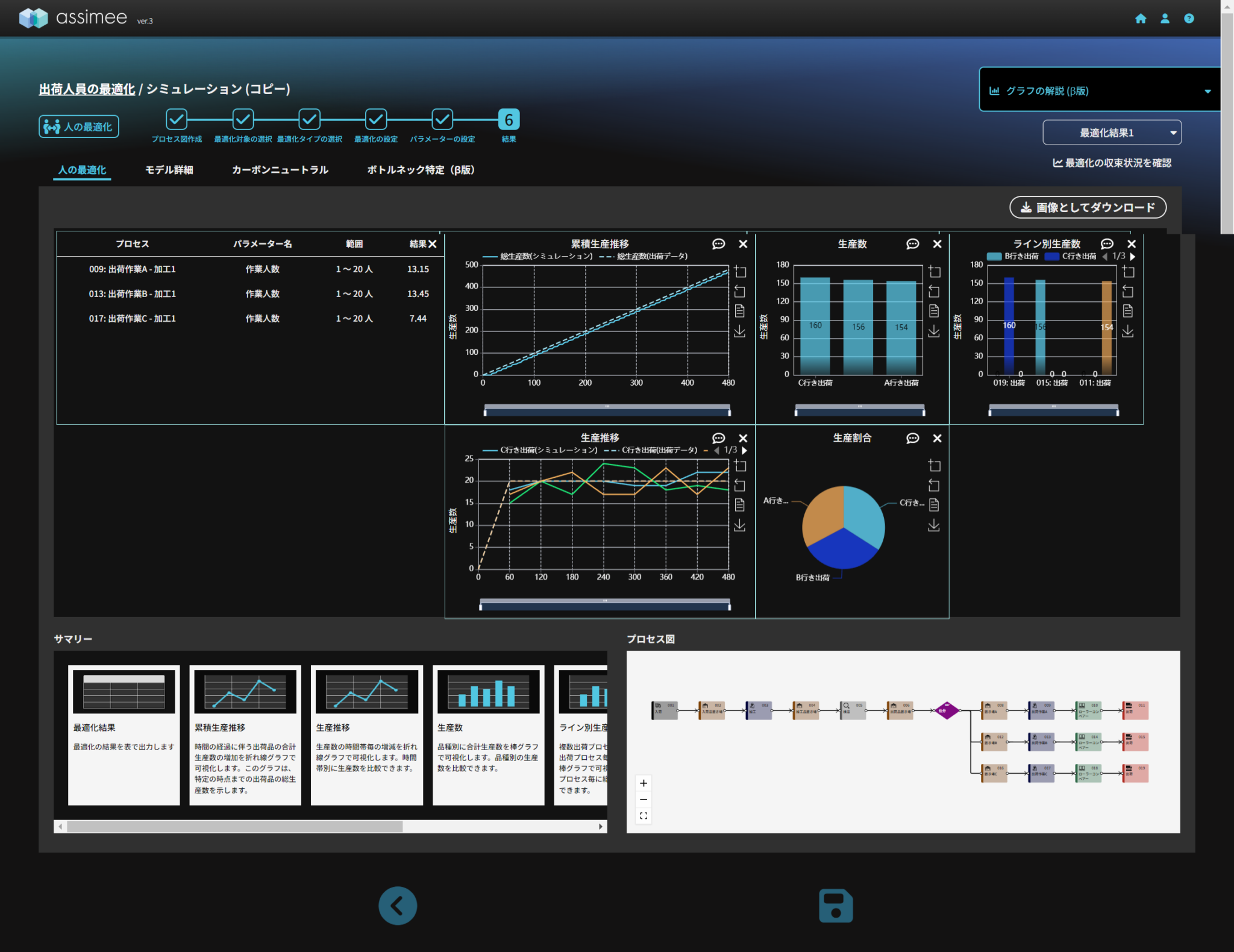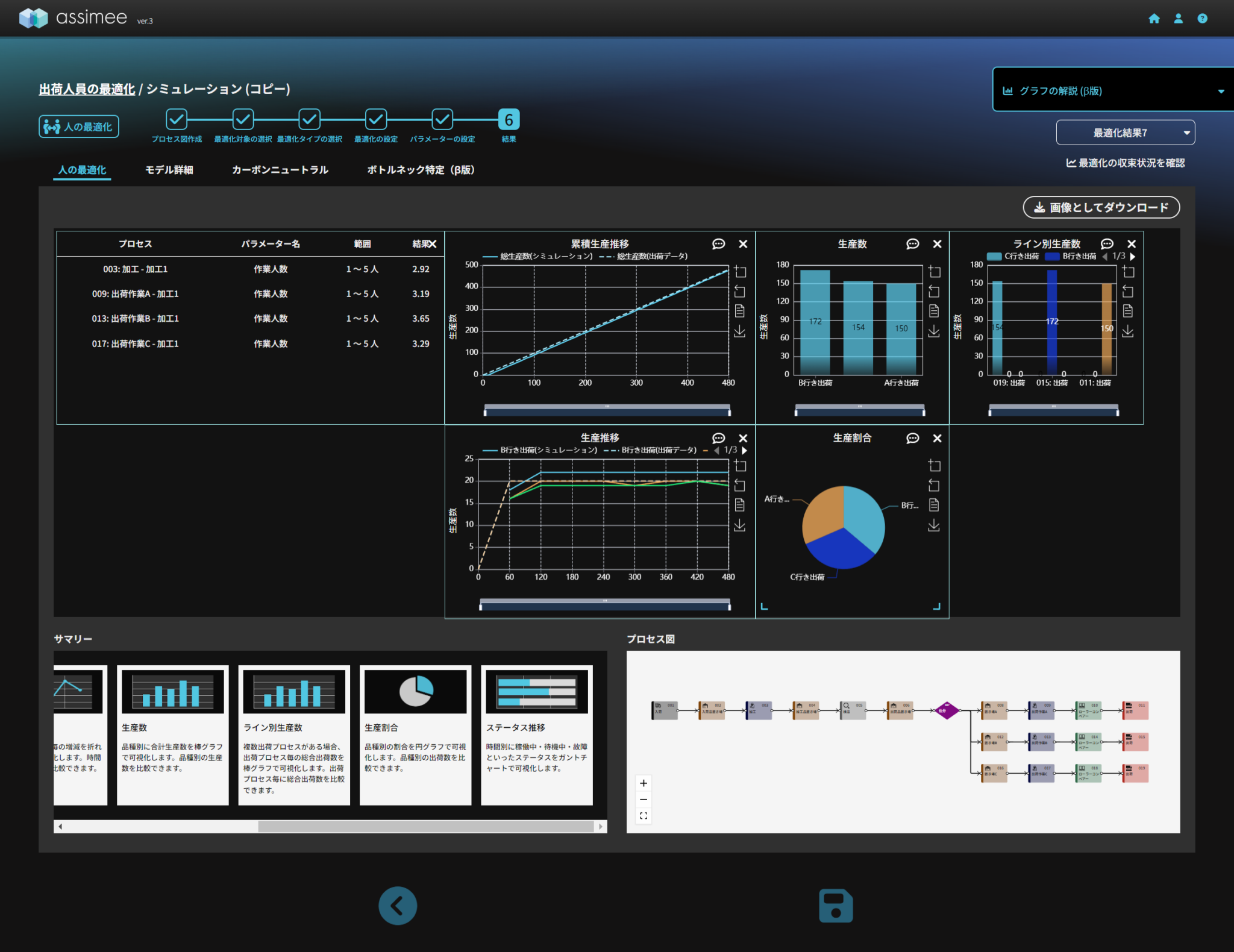 今回の記事では複数の出荷ラインをもつモデルに対して出荷量を人の最適化で調整する方法を解説しました。また、新しくassimeeに実装されたLLM機能を活用することで、ボトルネックの生じているプロセスの目星がつけやすくなり、最適化による課題解決が容易になりました。今回は、出荷作業だけを対象とした場合と、加工作業を対象に追加しモデル全体を対象+人数制限条件を追加した場合を検討しました。今回のようにボトルネックと指摘されている場所を多く含めるほど、人数を減らすことが出来る可能性が高まりますが、最適化の難度が上がる場合があること注意が必要です。