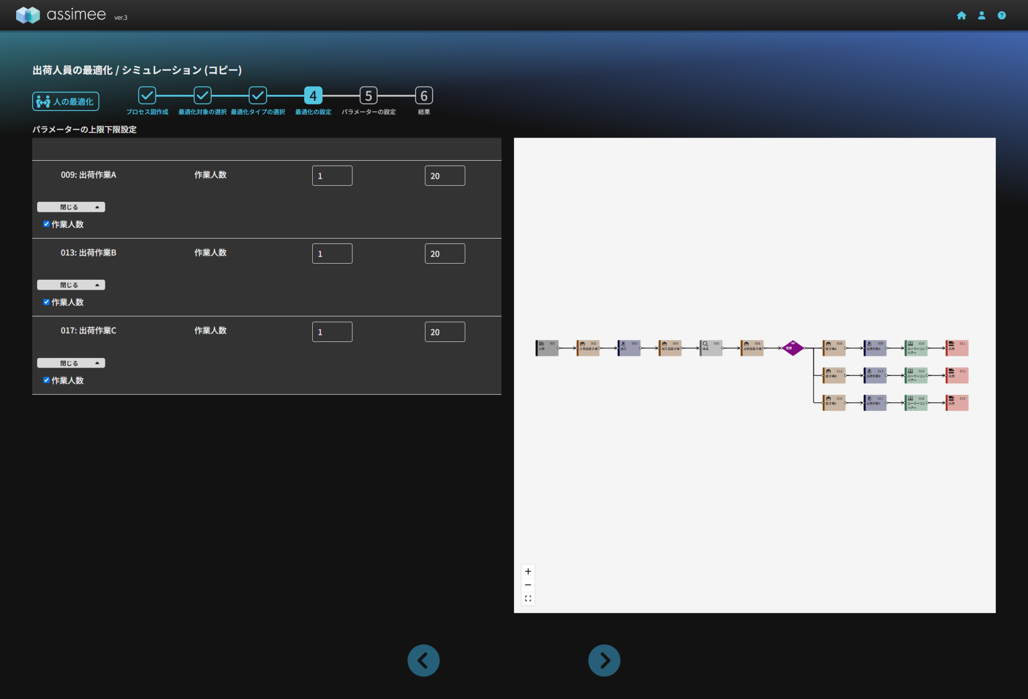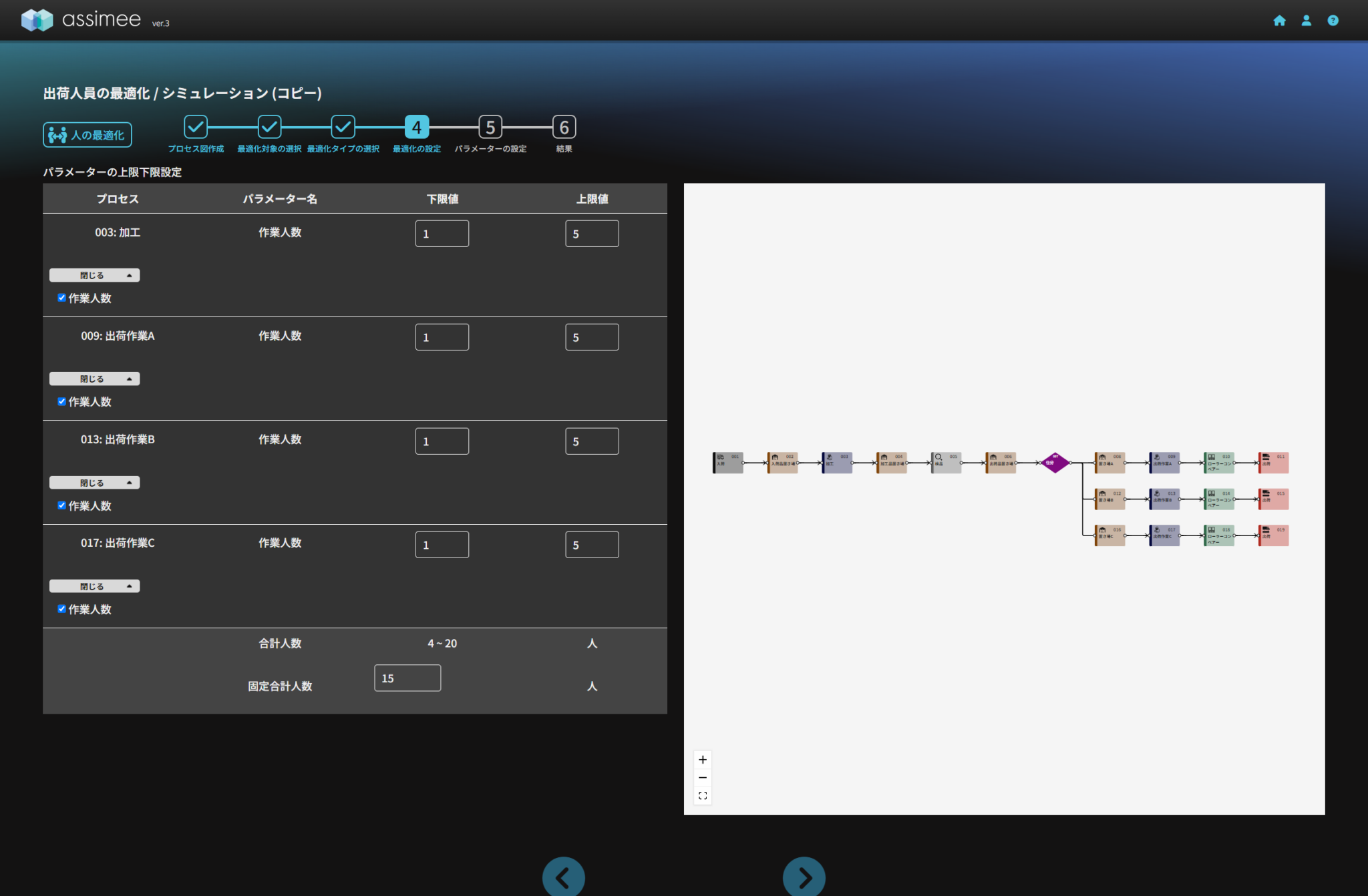 シミュレーション時点での人数は1人でしたが、生産数を6倍に増やすことを考えて、上記のように人の最適化のパラメーターの上下限値を設定して人の最適化を行ってみましょう。