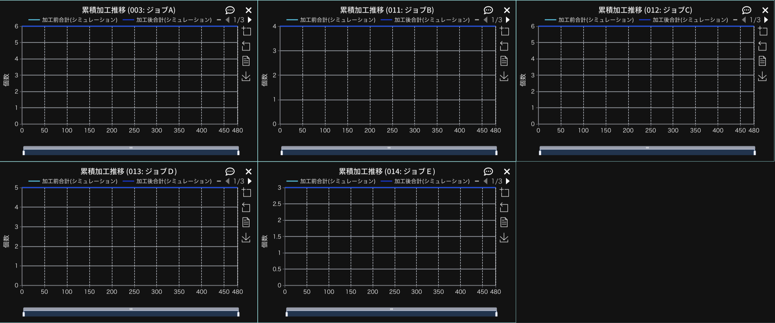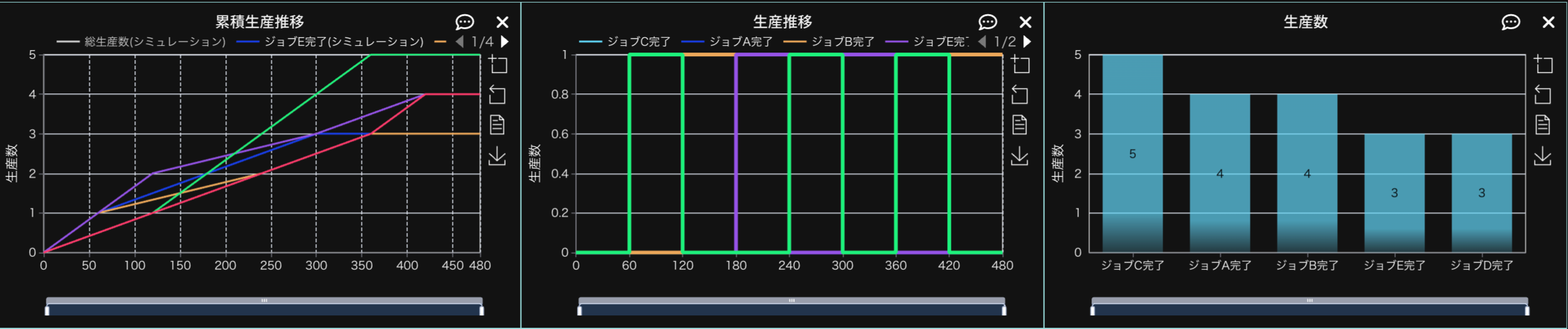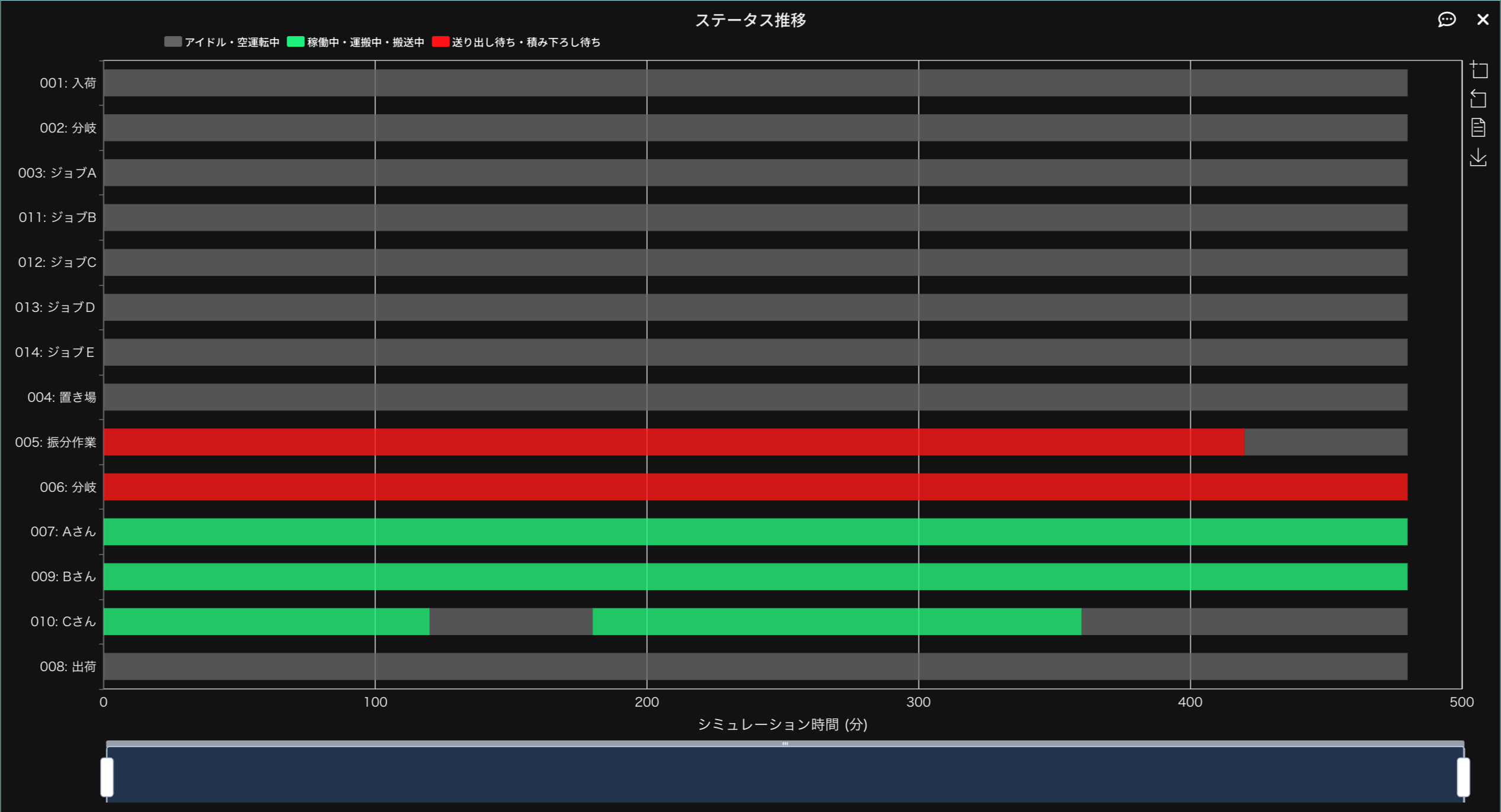 モデルを作成したら、シミュレーション時間を480分に設定してシミュレーションを行います。シミュレーション結果は以下の通りとなります。
