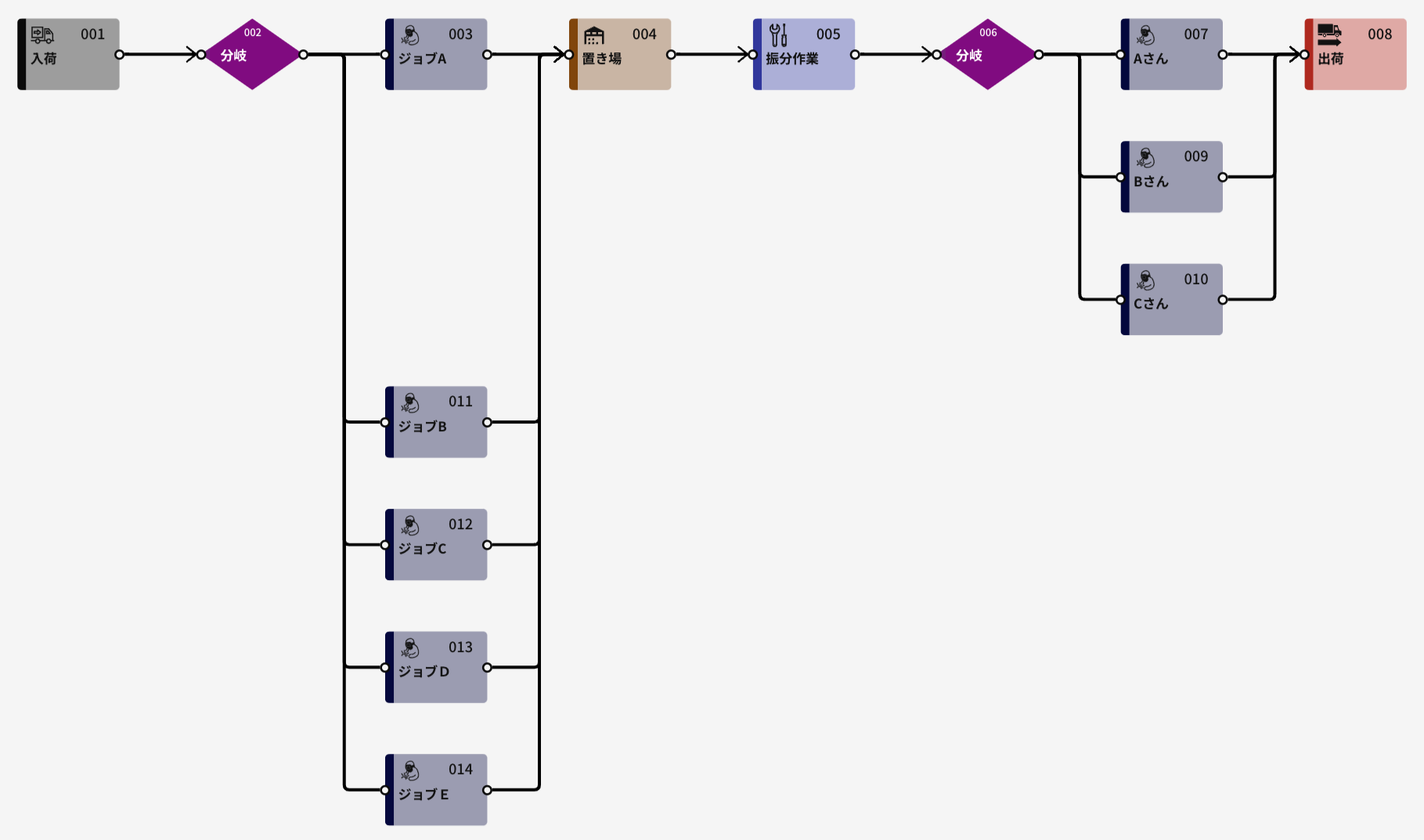 後半部分:生成したジョブを3人の作業員(作業員A〜C)に割り当てる部分