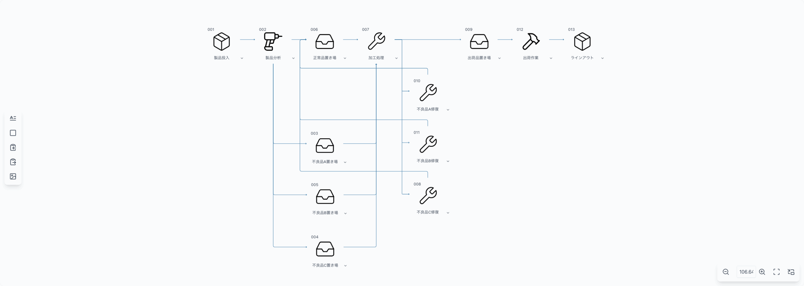 assimeeを活用することで、現実の生産現場で起こり得る不良品の混入とその修正工程を正確に再現することができます。今回のモデルでは: