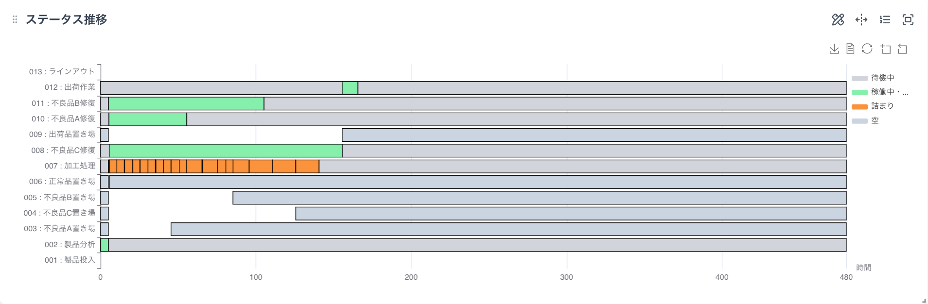 - ステータス推移を見ると、不良品の修正に要した時間が修復のためのカード(009不良品C修復、010不良品A修復、011不良品B修復)上に明確に現れており、稼働・待機時間の分布が可視化されます。