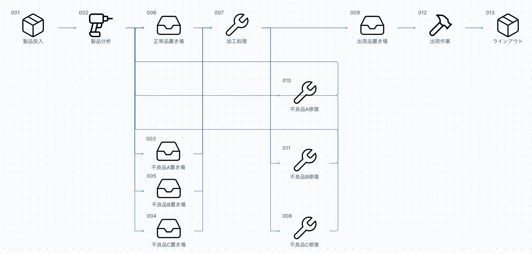 短いサイクルタイムで大量生産される製品ラインを対象に、不良の混入とその修復工程を以下のように再現しています。