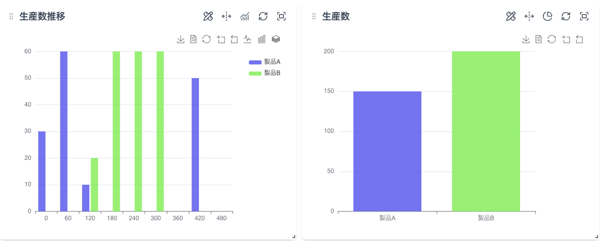 - 製品Aを0分から100個、製品Bを130分から200個、400分から再度製品Aを100個生産するように設定。